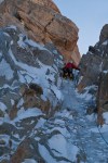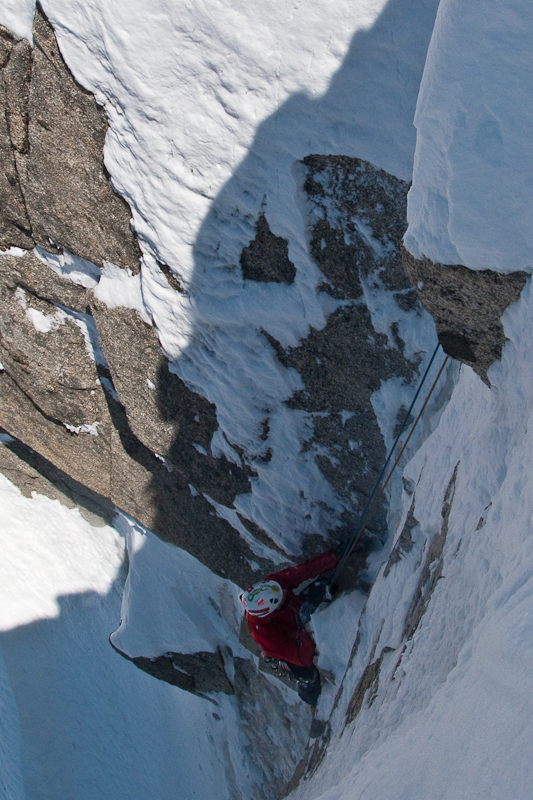 Na een vlotte start met één van de eerste bakken van de Aiguille du Midi, niet altijd even makkelijk in het weekend, beginnen we in een zinderende hitte aan de klim van de Cosmique graat. Daar moeten we na een tijdje 5 rappels maken om aan de start van onze route te komen, Burnier-Vogler III 4 M4+. Wat volgt zijn twee lengtes tussen 70-80°, drie lengtes ploeteren in diepe sneeuw en dan nog een leuke mixte lengte. We klaren het niet supersnel, maar om twee uur staan we toch weer boven op de graat. Inpakken en naar beneden gaan denk je dan… Maar Sam had het lumineuze idee om een aaneenschakeling te maken met Roger-Baxter Jones in het Maudit bassin.