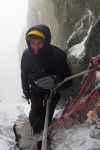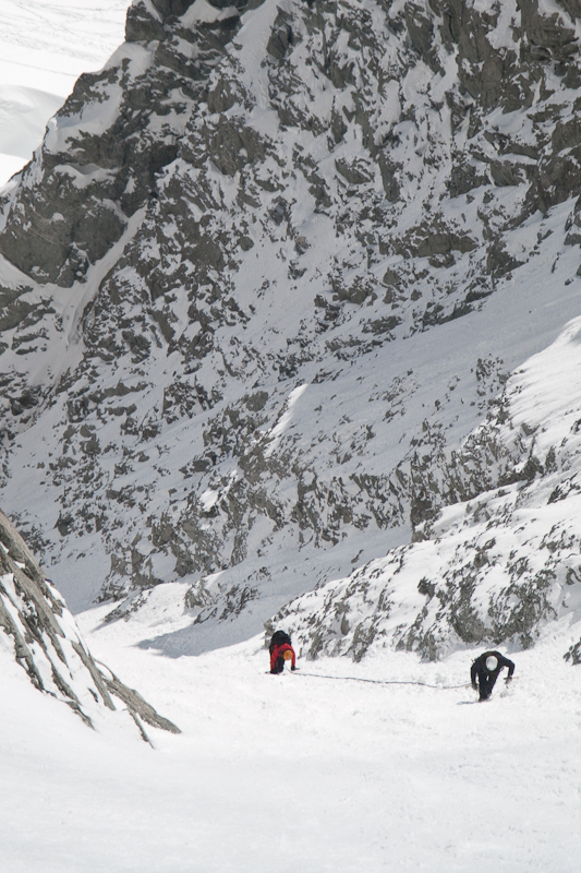 Enkel de start, 300m sneeuwcouloir, was weer ploeteren terwijl de zon ongenadig hard scheen. Gelukkig kwam er daarna een grote wolkenbank opzetten die de zon verduisterde en zelfs voor wat sporadische sneeuwvlokken zorgde. Samen met de spindrift zorgde die voor een ‘aangenaam’ klimweertje.