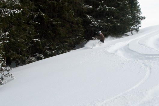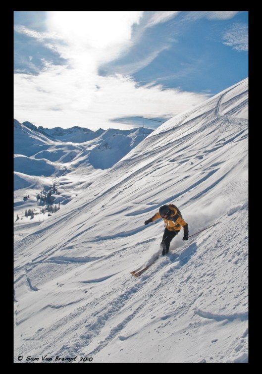 Na onze klimdag in winterse omstandigheden bleek er een 10 cm verse sneeuw te liggen. Toegeven veel was het niet maar met al 3 dagen ijs in de armen was het even tijd voor de benen om zich moe te maken. Misschien dat die 10 cm wel meer was op 2000m hoogte dachten we. 30 minuutjes van Kandersteg ligt het skigebied Adelboden/Lenk. Een gebied met veel freeride mogelijkheden zowel open velden als bos.