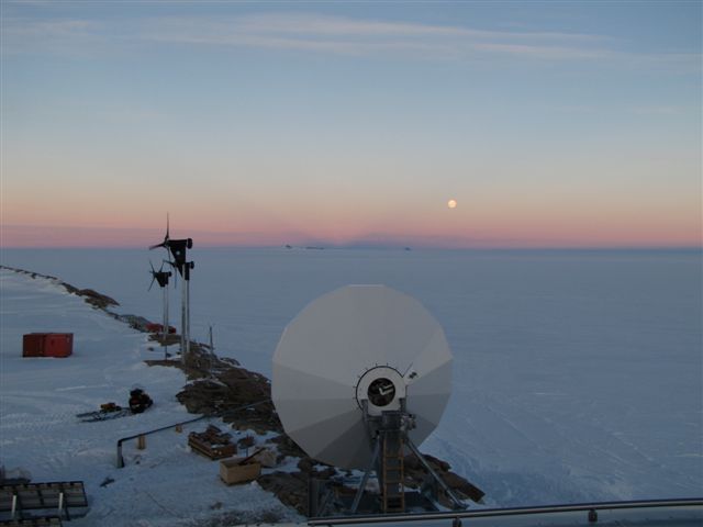 Het is februari en het schemert al wat ’s nachts. De maan is voor het eerst weer zichtbaar. Op bovenstaande foto, genomen van op het dak van de basis, zie je achter de windturbines het nieuwe brandstofdepot. Gisteren heb ik overigens gewerkt aan de montage van vijf nieuwe windturbines, als afwisseling. En op de voorgrond een reden tot vreugde, deze satellietschotel zorgt sinds gisteren voor onbeperkt internet!