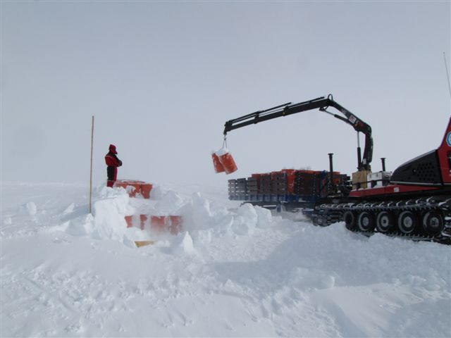 Het was niet de beste week van mijn Antarctische avontuur, maar het moet dan ook niet altijd plezant zijn. Langs de airstrip lagen 800 vaten brandstof opgeslagen, diep onder de sneeuwdrift begraven. Vorige week was het nieuwe depot afgewerkt, op de ridge naast de basis en al die vaten moesten daar dus naar verplaatst worden. Omdat Alain en ik nog de enigen zijn die met Prinoth en vooral de gevoelige HIAB-kraan kunnen werken, was dat ons werk voor deze week.