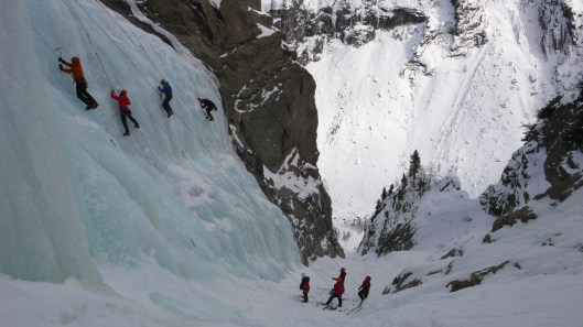 Jonas en Tim stegen in naar Placche di Rovenaud , beide cordees kozen elk voor een andere lijn op deze waterval.
