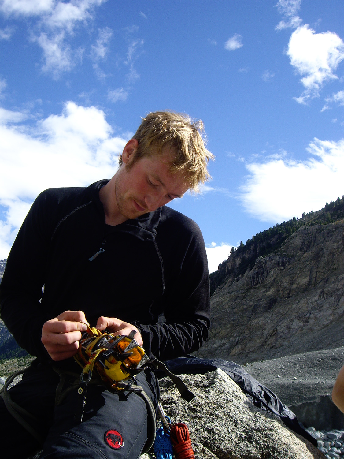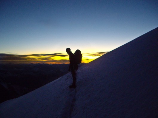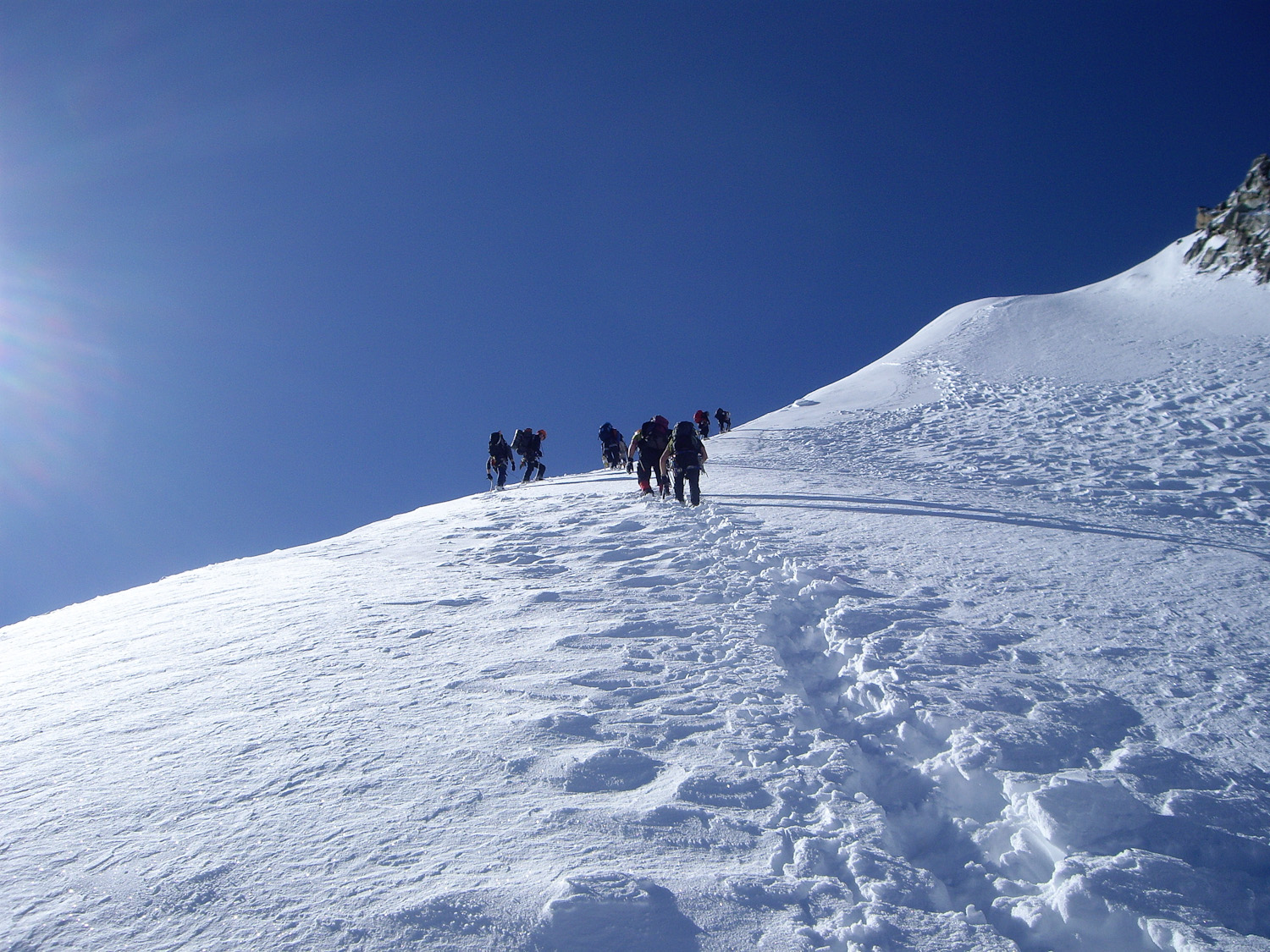 De wekker om 3 uur deed pijn, en het duurde dan ook tot 4u30 tot we goed en wel vertrokken waren. Tegen 5u30 hadden we alle cordées, die een uur voor ons vertrokken waren in de hut, min of meer ingehaald. Omdat het de voorbije dagen veel had gesneeuwt was de instijg best vermoeiend en was het Jonas die de eer kreeg om te sporen door kniediepe verse sneeuw.