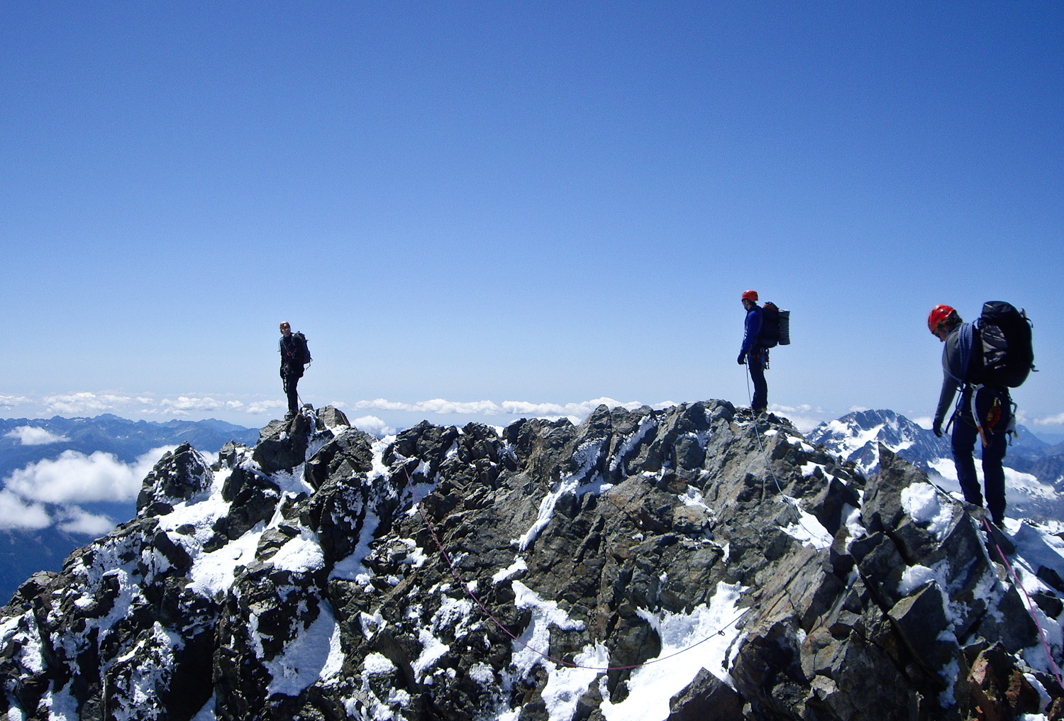 De lange sneeuwgraat komt uiteindelijk uit op de ‘Punta Alva’ van waar nog een behoorlijk stuk rotsgraat vertrekt tot op de top. Behendig, maar toch al wat vermoeid, klimmen we de graat eerst af, tot op het laagste punt tussen de twee toppen, en dan weer op tot we op de langerekte top van de Bernina komen. We hebben het gehaald! En wel als eerste!