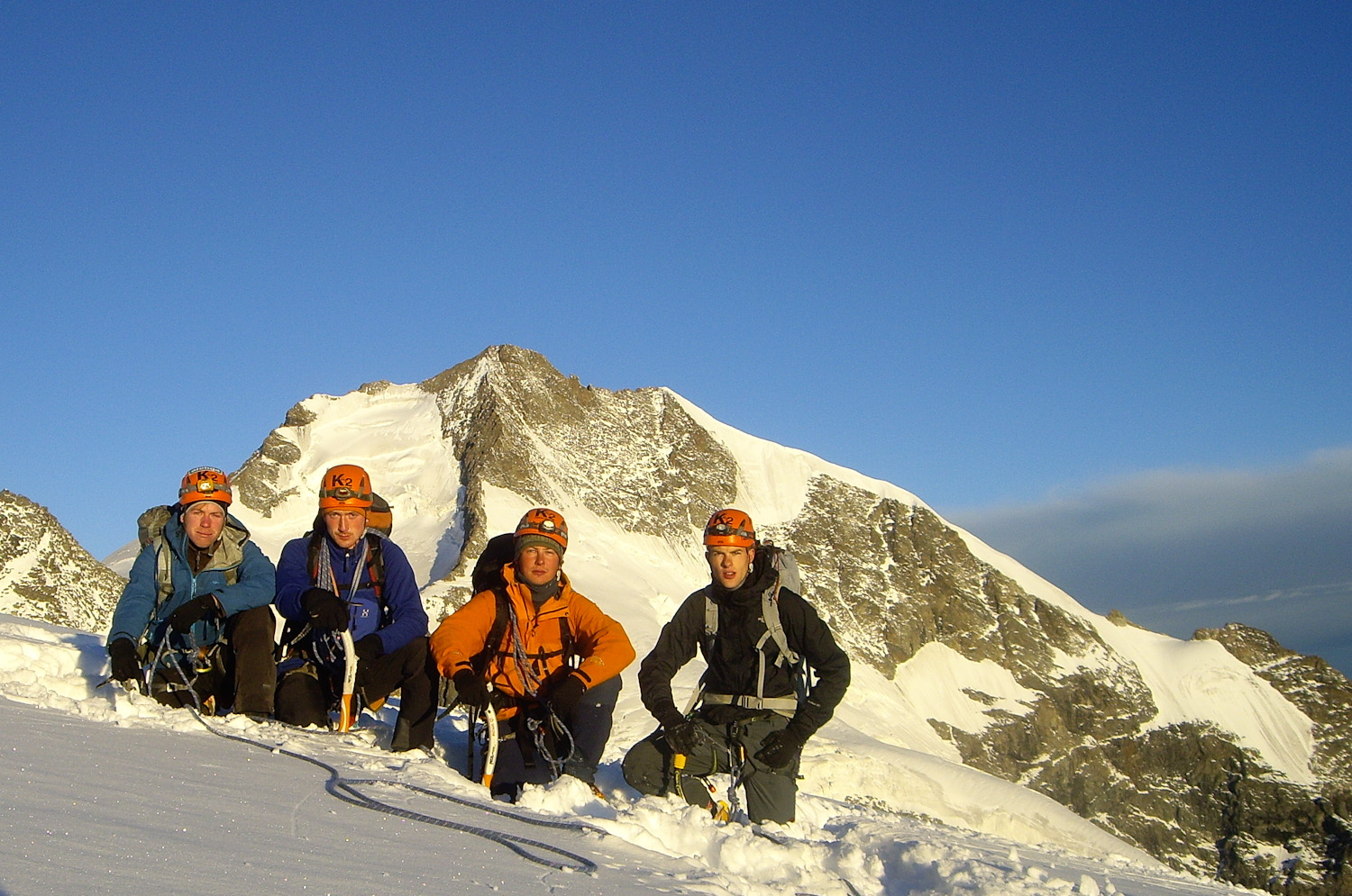 Toen echter twee Oostenrijkse gidsen met 3 klanten heel vriendelijk vroegen of ze niet, kort op elkaar ingebonden, door mochten gaan, zagen we dat die 2 opeens alle cordées voorbij race’ten… Wat zij kunnen kunnen wij ook! Snel bonden we in op een 3-4 meter van elkaar en al gauw hadden we de eerste 3 cordées achter ons gelaten. Toen we echter een stel Duitsers wilden inhalen waren die daar niet zo gelukkig mee, en na wat tikken op Jonas’ helm en met crampons bijna op z’n hand te stampen besloten we dan toch maar om achter hen te blijven tot op de sneeuwgraat.