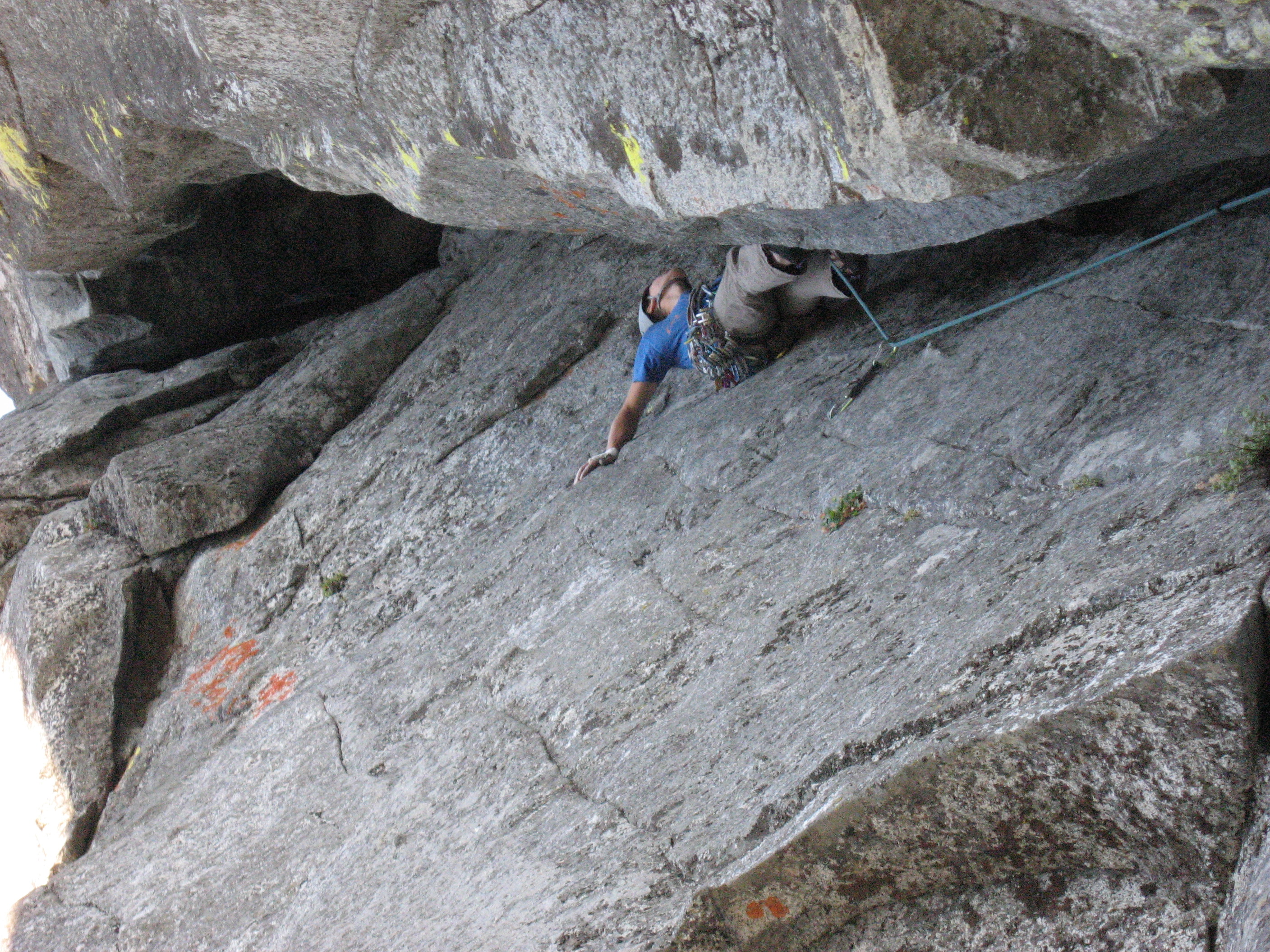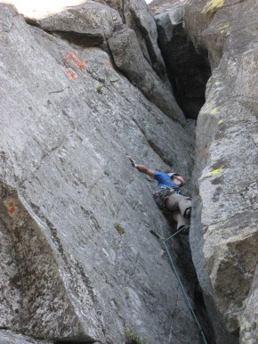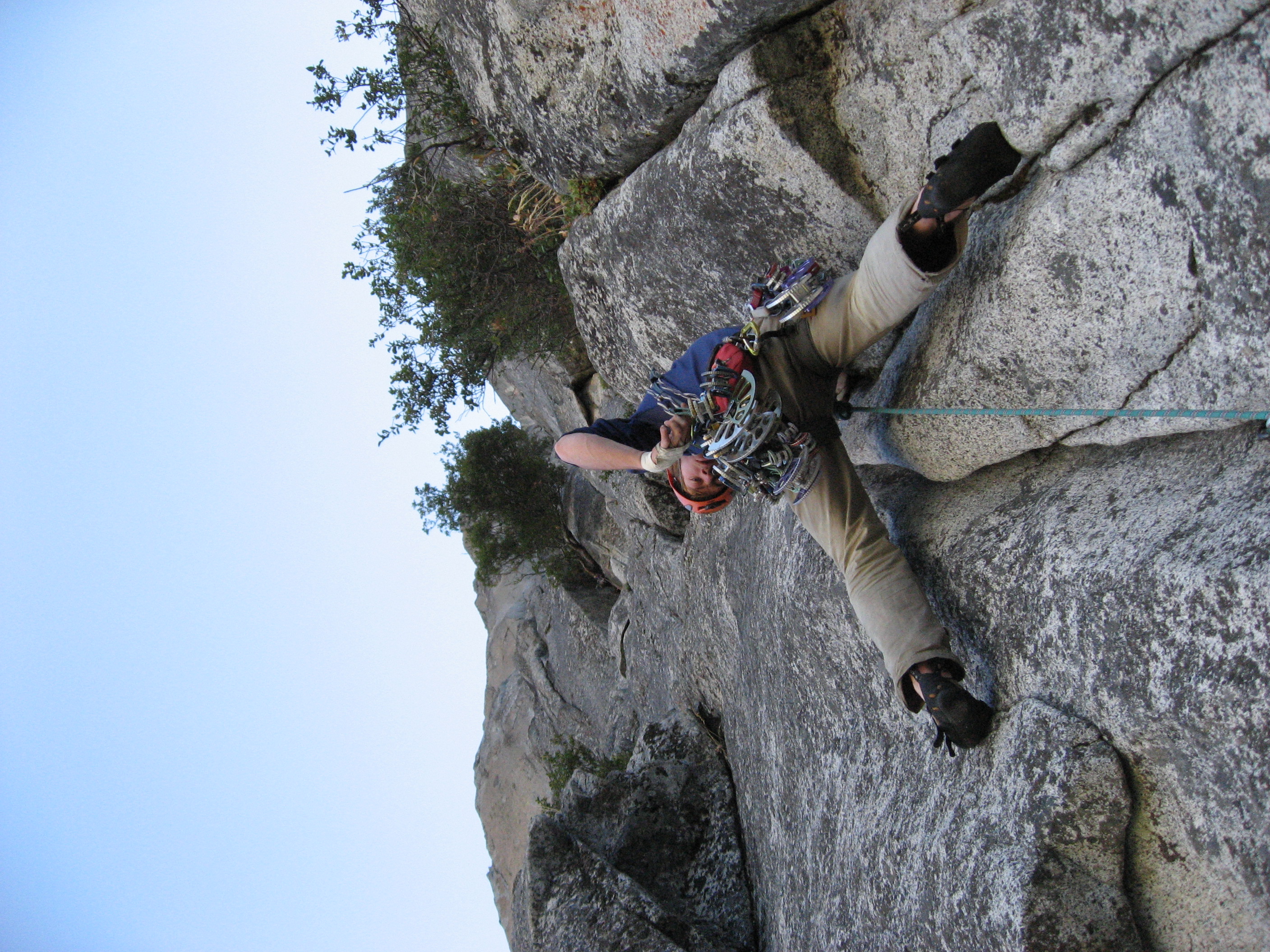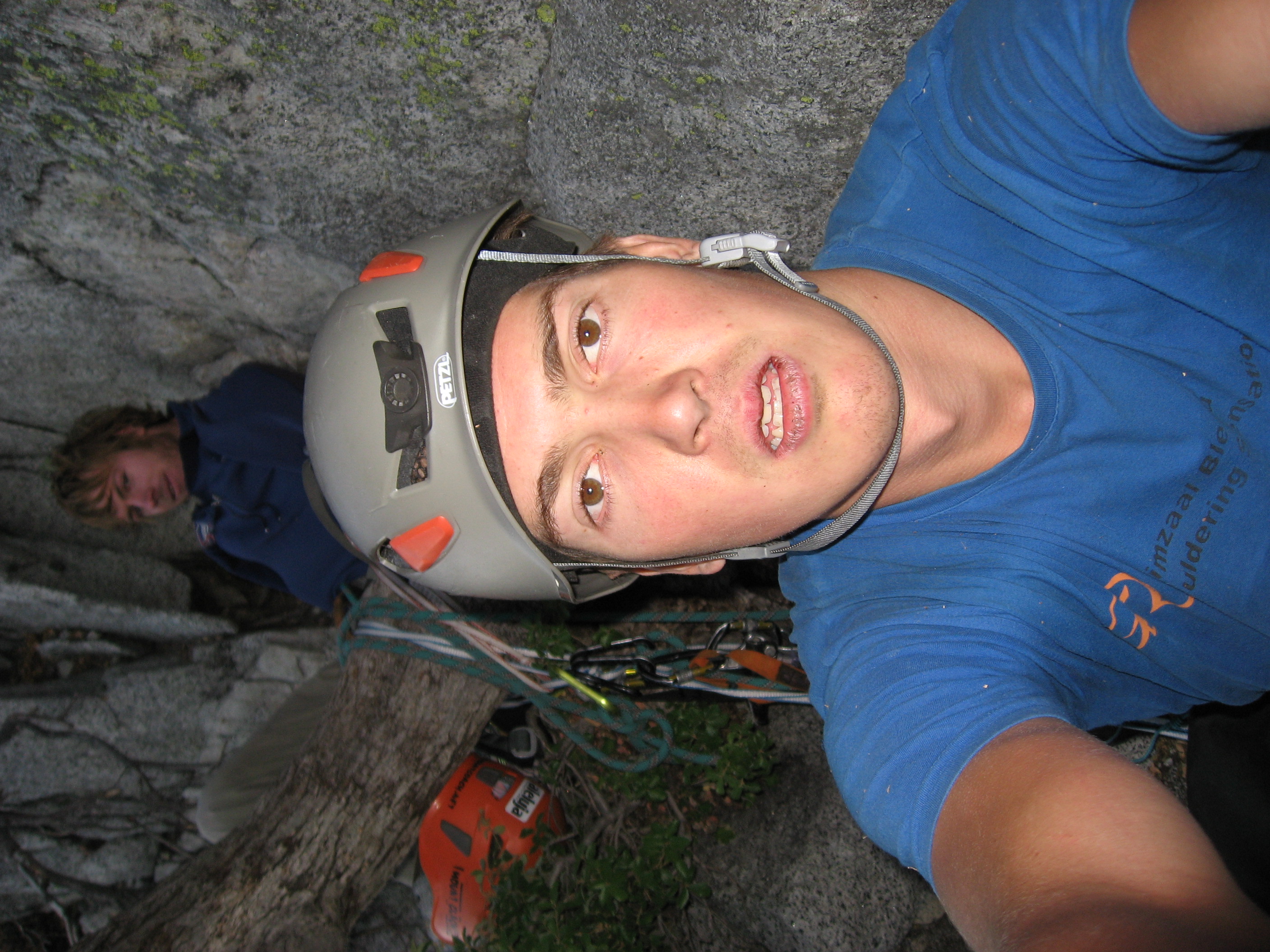 Met veel gekreun in de chimneys en nog meer gevloek op die verdomde rugzak vorderden we langzaam. Aan het eind van de 10de lengte keken we naar boven, We stonden net onder 2 chimney lengtes die er verschrikkelijk uitzagen. daarna keken we met een angstige blik naar elkaar. Met een lichte aarzeling vroeg ik aan Stijn ‘’ ziede gij het zitte om de volgende lengte te doen?’’. Gelukkig maakte hij er geen probleem van. Met verzuurde bovenbenen kwam Stijn toe aan de relais. Oef daar zijn we vanaf dacht ik. Maar uiteindelijk bleek dat de cruxlengte boven ons zat. Alweer ging Stijn van start. Met veel getrek en gesleur kwam hij aan een punt waar je ongeveer een 7 tal meter boven de laatste slechte zekering in een offwidth moet kruipen, om dan vervolgens nog een meter hoger een goede greep te gaan halen. Na enkele moedige pogingen besloot Stijn om toch maar te passen voor dit tricky stukje en mij een poging te laten doen. Met veel schrik begon ik aan de lengte, bij de crux besloot ik gewoon door te gaan en niet te veel na te denken. Ik kroop in de offwidth, met heel mijn lijf gespannen tussen de 2 kanten van de 60cm brede barst, af en toe terug schuivend naar beneden kwam ik steeds dichter bij de goede greep. Eens ik de greep vasthad, riep ik een vreugdekreet die tot in het dal te horen was. Yihaa!!! De weg naar boven is terug open!!!