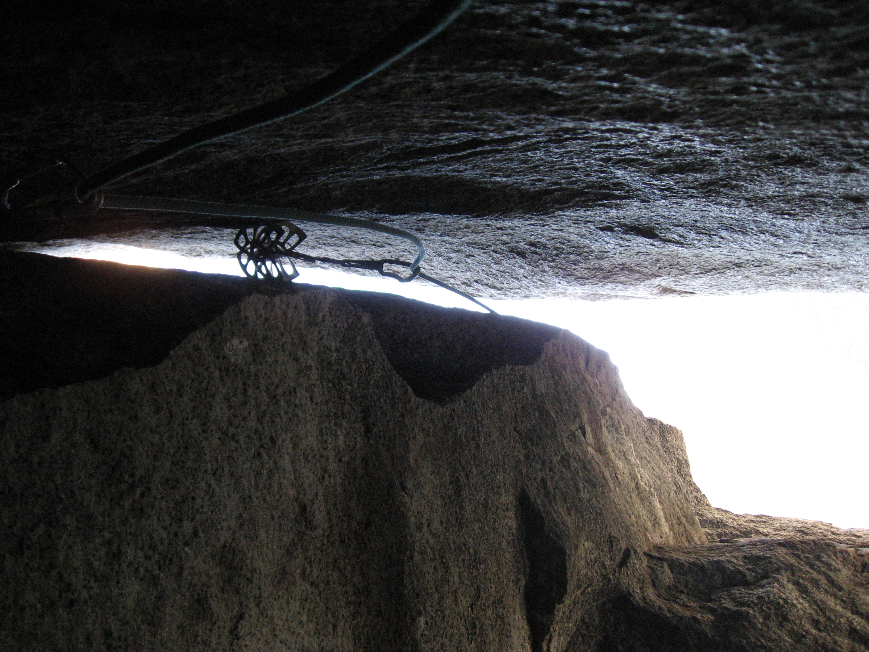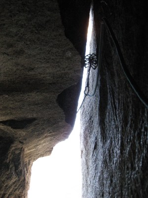 Stijn klom vlot de eerste lengte, maar toen ik moest naklimmen was duidelijk dat we iets essentieel vergeten waren : de haulline. Het klimmen in de Chimneys met een rugzak, die goed volgeladen was met water, eten en schoenen is gewoon onmogelijk. Met een zelfgevonden oplossing slaagden we er toch in om de zak te haulen. Het kostte ons wel 2 keer zoveel tijd.