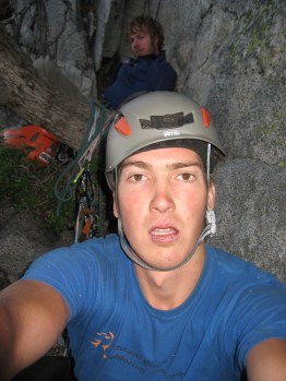 Ondertussen begon het al te schemeren, en hadden we nog 4 lengtes voor de boeg. We probeerden ons te haasten, maar al gauw werd het pikdonker. We klommen nog 2 lengtes in het donker, maar dan besloten we om te bivakkeren op een smalle ledge. Stijn probeerde zich met de touwzak, en ik met een dunne fleece te beschermen tegen de koude. Tevergeefs want heel de nacht hebben we gebibberd. Toen we de volgende ochtend helemaal uitgeput opstonden bleek dat we nog maar 1 lengte moesten doen. De vreugde was immens groot als we op de top van deze mooie wand stonden.