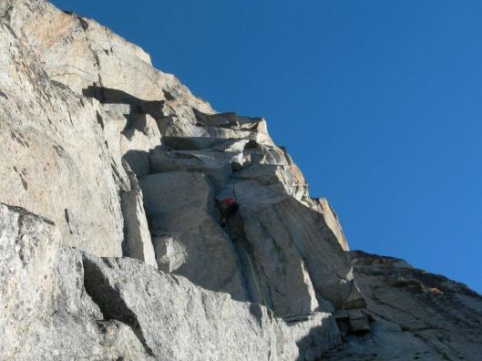De zon komt net in de wand als Marc aan de eerste touwlengte begint. Ik krijg gelijk wanneer de twee Oostenrijkers zich naast me beginnen klaar te maken voor dezelfde route. De eerste touwlengte is “maar” een 5c+, maar moeilijk qua routeverloop en lastig af te zekeren. Wanneer die twee gasten zien hoe Marc zich door deze touwlengte worstelt, maken ze rechtsomkeer en doen de ernaast gelegen route Via Miki (5c). Vrij baan voor ons dus en het wordt een waar plezier. De ene touwlengte wordt nog mooier dan de vorige, eindeloos dulferen over prachtige barsten. Na 7 heerlijke touwlengtes komen we boven, waar we Peter en Tom vinden die de Via Classica (5c+) beklommen.