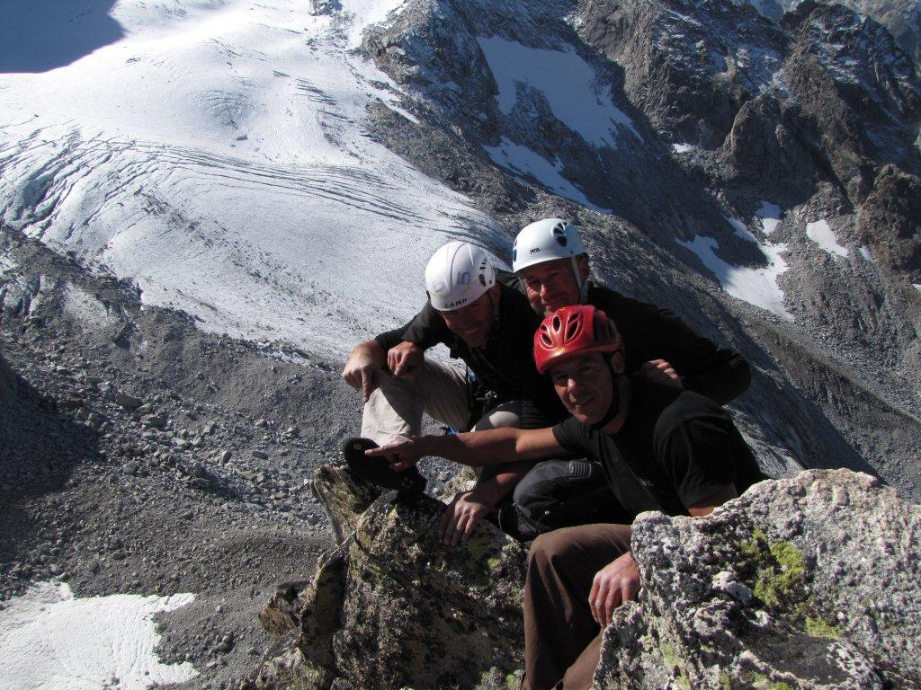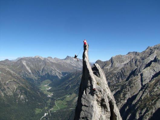 Dinsdag klimmen we met zijn allen op de Spazzacaldeira. Peter en Marc Vanlommel doen de leuk klinkende route “Steinfresser”, een stevige 6a multipitch. Peter Mombert en Marc Van Aerde leven zich uit in Via Leni, waar ze de angsten van plaatklimmen herontdekken. Tom en ik klimmen in sneltreinvaart Dente per Dente, 250m 6a+. En passant halen we 8 cordées in en komen als eerste aan de beroemde “Fiamma”. Die beklimmen we snel, zodat de rest niet hoeft te wachten, er staan zo’n 15 mensen te wachten op hun fotoshoot. Daarna beklimmen we op ons gemak de nabijgelegen “Dente” en nemen wat leuke foto’s. In de vroege namiddag vind ik mijn hele ploeg terug op het terras van de Chamanna Albigna 2336m. Een perfecte uitvalsbasis voor een laatste beklimming.