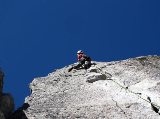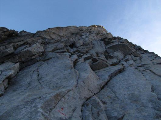 Het is onze laatste dag. Tegen de avond moeten we terug in de kazerne van S-Chanf zijn en donderdag rijden we terug naar België. Tijd voor een mooie afsluiter. In mijn topo “Nichts als Granit” zie ik enkele intrigrerende foto’s over de “Snoopy” op de Biopfeiler. Een route uitsluitend op friends en nuts te beklimmen, 1 touwlengte 5c+, 4 touwlengtes 6b+, een 6c en een 6b om af te sluiten. Helemaal mijn ding dus. Na een vrij laat ontbijt, stijg ik samen met Marc in naar de route. Onderweg halen we twee Oostenrijkse gidsen in. Die hadden Marc de avond ervoor nog afgeraden om in deze route te klimmen. Ik vraag welke route zij willen doen, maar ze blijven vaag. Marc en ik versnellen nog wat, want ik vermoed dat deze jongens ook in Snoopy willen kruipen.