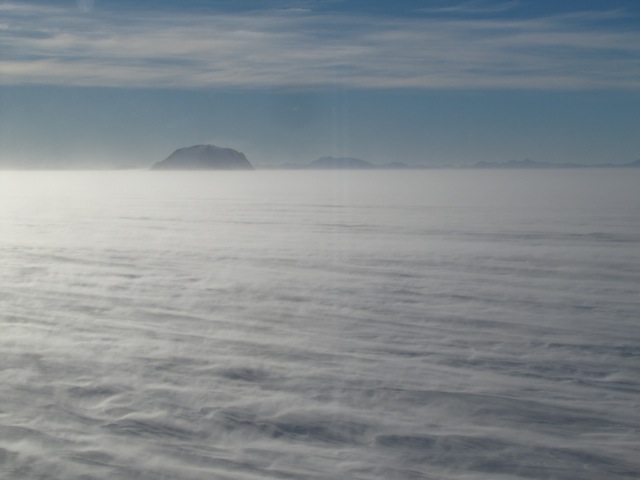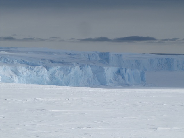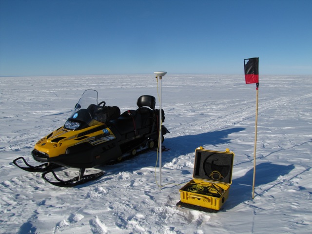 Frank vertelt me dat hij die dag met Jean-Jacques Derwael gebeld heeft. Deze topograaf heeft in de jaren 50-60 de omgeving van de Roi Baudouin iceshelf opgemeten en de icerise is naar hem genoemd. De man moet ondertussen rond de tachtig zijn en was vrij geëmotioneerd dat iemand hem opbelt vanop “zijn” icerise, nadat daar 50 jaar lang niemand meer geweest is. “Pas op voor de spalten, hé!” wist hij nog mee te geven ;-) Na een korte nachtrust gaat het met een treintje Prinoth en twee skidoos langzaam op weg naar de Frankkenny icerise. Langzaam, want aan de snelheid van 8km/hr maken we nog een radarprofiel van deze as van 100km lang. Onderweg moeten nog drie GPS metingen verricht worden, dat duurt zo’n 45 minuten per meting.