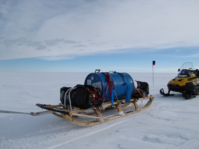 Na twee weken onophoudelijk rondcrossen met skidoos, bereikt de brandstofvoorraad een laag peil. Hoog tijd om eens te gaan kijken in het kamp van Frank & Kenny en ze te bevoorraden. Geladen met een slee met een vol vat petrol van 200l, een nieuwe gasfles en nog wat “goodies”, vertrek ik voor een tripje van 80km naar het tweede kamp. Onderweg bevindt zich een gevaarlijke zone met crevassen en het weer is barslecht. Ik vraag aan Thierry, één van de wetenschappers om mee te rijden, je weet nooit of ik met die slee van 250kg een kloof in rijd. Op weg voor een nieuw antarctisch avontuur rijden we op GPS over “the great white plains”.