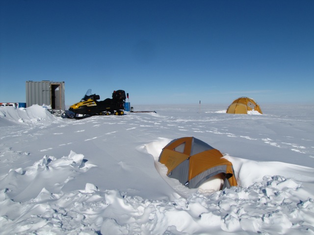Hun kamp is erg ondergesneeuwd, maar dat kan ik pas later oplossen. Thierry en ik eten snel wat Japanse gevriesdroogde sushi en rijden daarna dezelfde trip terug, alweer een dagje van 160km alle terrein. Soms kan je goed doorrijden, maar meestal hobbel je moeizaam over zones met sastrugi. Slecht voor de rug allemaal, vooral sleuren met vaten van 200kg. Eens terug hebben we nog een dag goed weer, waarbij het boren in de rift goed vooruitgaat. Maar dan volgt een storm, die de twee kampen onder de sneeuw bedelft. Als we ’s avonds Frank aan de telefoon horen, klinkt daar wat stress in door en hij vraagt of ik de volgende dag naar hen kan komen en hun kamp opbreken. Eerst werk ik 5 uur in kamp 1 om daar alles uit te graven en ik trek alle sledes met containers al los en zet ze met de kop in de wind. Dan weer op weg met mijn skidoo, over de ondertussen met een dun laagje sneeuw dichtgewaaide crevassen naar kamp 2. Om het gevaar te verkleinen, rijd ik aan hoge snelheid. Zo spring je al snel met gemak over crevassen van 2m breed, spanning en avontuur. Alleen 80km rijden over een iceshelf… hier kan ik me niet veroorloven in een kloof te verdwijnen. Als ik in het kamp van Frank & Kenny aankom, is daar amper iets van terug te vinden.