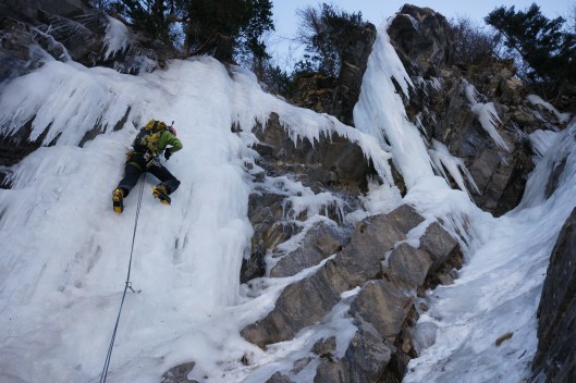 De temperatuur zakte ineens enorm en we besloten de volgende dag eens op verkenning te gaan. Geen klassieker, maar een waterval die slechts enkele dagen ervoor geopend was. Na lang zoeken langs een beek bleek de waterval uiteindelijk toch minder interessant te zijn dan dat de foto’s lieten uitschijnen. We hielden ons dan maar bezig met ettelijke keren een verticale pilaar van zo’n 15m te klimmen als training, net wat ik nodig had!