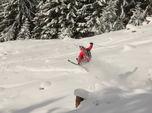 De volgende dagen doorkruisten we het Salzburgerland alsof we aan het dromen waren. Dag na dag bleef de sneeuw maar vallen, steeds zonder een zuchtje wind. Van Tauplitz naar Zauchensee en via Sport Gastein naar Krippenstein… Ik heb zelden zo geskiet tussen de bomen. Sneeuw tot aan de knieen die je niet afremde, eerder gewoon ontplofte in je gezicht. Na 2 winters zonder poeder had ik HONGER, en alles waar ik al zo lang naar op zoek was lag op de besneeuwde flanken rond me. Samen met wat vrienden uit Nederland en Belgie krassten we alles vakkundig af.