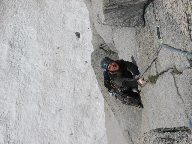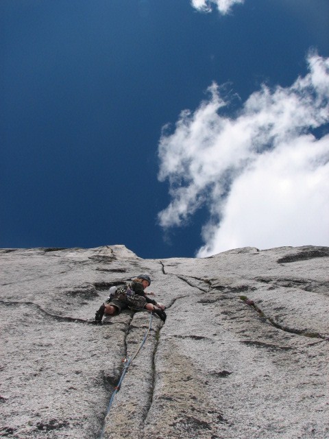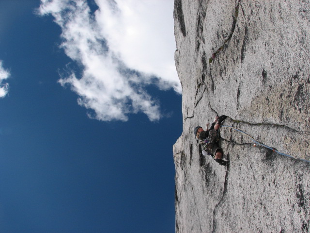 Tijdens onze rustdag beneden in Invermere had ik in de topo mijn oog laten vallen op fingerberry jam. “Series of thin clean cracks”stond er in de topo geschreven. Dat kon niet slecht zijn…. en inderdaad. Wat een lijn!!! Toen we onderaan de fingerberry tower stonden bleek de lijn wel heel duidelijk. Een smalle barst van 300m volgen tot de top. Dit was gewoon zalig klimmen… en wat een omgeving met aan de linkerkant het silhouet van de south howser tower. Ik kon het niet laten om af en toe de nodige woehoe!!! vreugdekreten uit te schreeuwen.