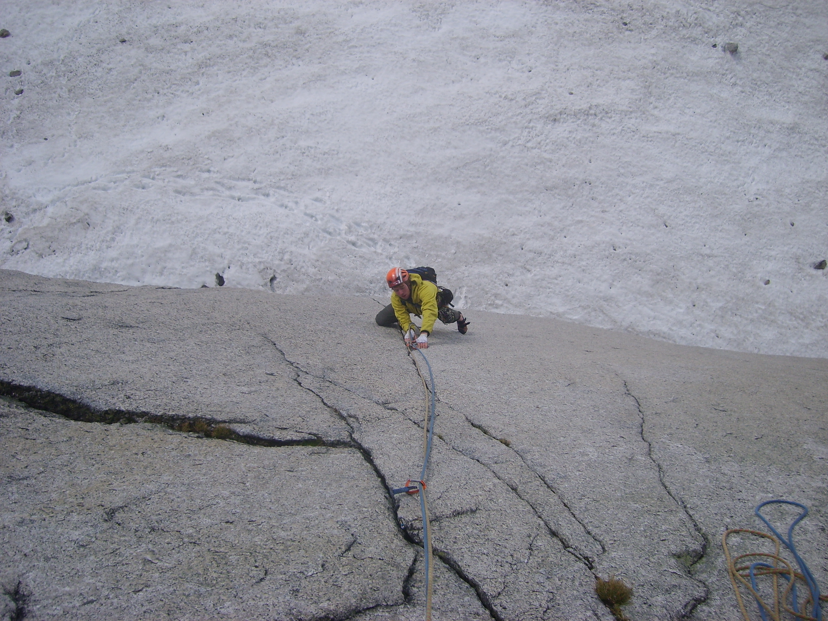 De klimlijn was eenvoudig, de afdaling…. dat was moeilijker dan we gedacht hadden. Normaal daal je af in een andere lijn en volgens de topo zou die duidelijk te vinden moeten zijn als je op de top staat. Na meer dan een uur rondlopen als 2 kiekens zonder kop op de top zag het ernaar uit dat we de afdaling langs de normale kant maar niet gingen vinden. Dan maar de afdaling ingezet langs de fingerberry jam zelf. Met enkele rappels op losse flakes, touwen die blijven zitten en een strakke koude wind konden we toch weer spreken van een kleine epic:).