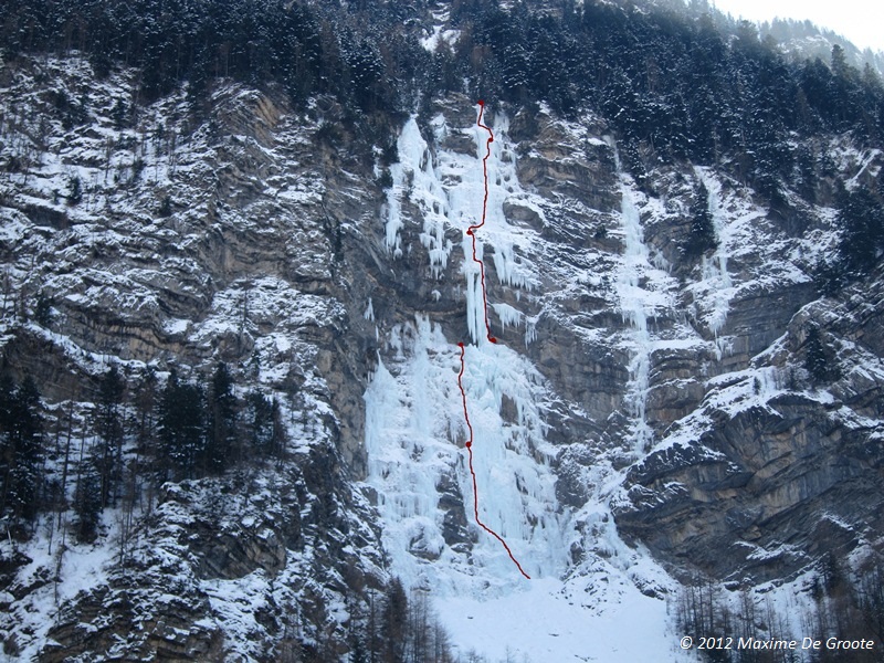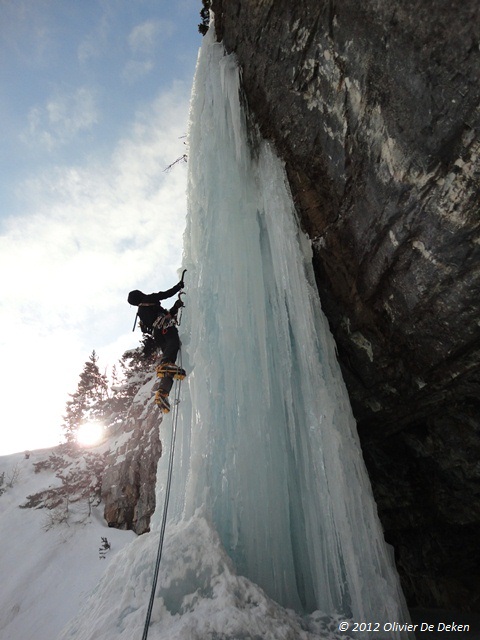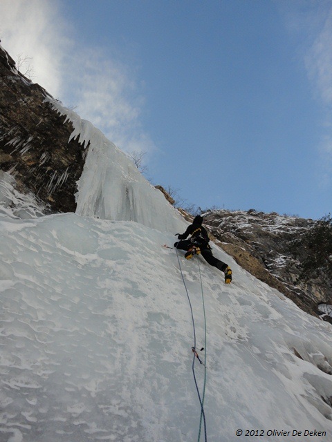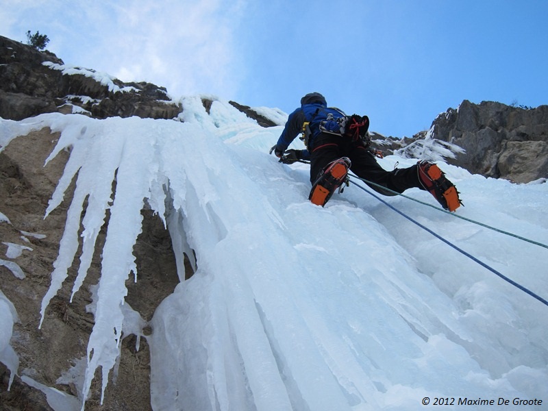Aangekomen in het drop ‘Les Viollins’ spotte Maxime al van ver dat ‘Cascade des Viollins 200m III 5+/6′ in conditie lag (de 30m lange sigaar van de derde lengte was gevormd…), dus de beslissing was daarmee ook ineens gemaakt. Maxime vatte de eerste lengte van 85° met afwisselend iets natter, dan weer iets harder ijs, aan, maar door de ochtendlijke kou (-18°C) konden we aan de relais genieten van het “fijne” gevoel van ontdooiende vingers… De tweede lengte bestond volledig uit bloemkolen die vreemd genoeg heel vaak bestonden uit schijven ijs met lucht ertussen, maar vooral bedekt waren met een goede laag poedersneeuw afgewerkt met een topping van een paar millimeter ijs. Kortom voor elke slag moest ik dit van de waterval afkloppen, en bijgevolg heeft Maxime een hele lengte lang sneeuw (en ijs?) over zich gekregen… Deze lengte bracht ons bij de crux lengte, nl. de 30m lange sigaar. Zoals we vanuit de wagen al hadden gezien eindigde de sigaar met een kleine overhang, en dan nog een verticale muur. Toen ik boven kwam aan de relais bij Maxime zij hij: “Man, afzien, maar echt genieten bij elke slag hé!” Inderdaad, zalig luchtig klimmen op de sigaar, verzuren in de bombé en dan nog de muur, puur genieten!!