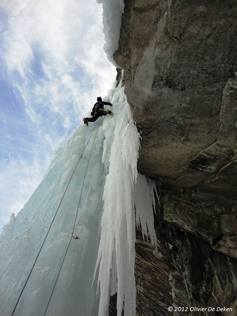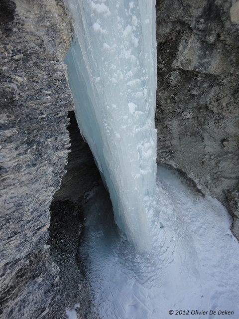 Hierna volgde nog een mooie lange lengte van ongeveer 50m. Dit was een goed gevormde 80°/85° stuk, eindigend in een verticale muur van een 8-tal meter. De laatste lengte was nog een klein sigaartje, maar deze was zeker en vast niet te onderschatten, daar het ijs fragiel was, en voeten bijgevolg een delicate bedoening waren.