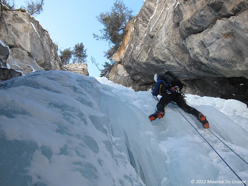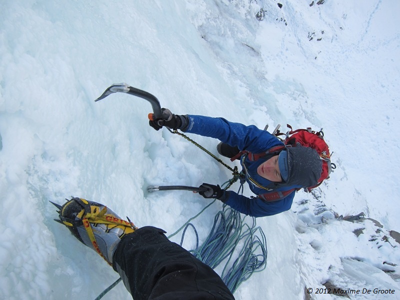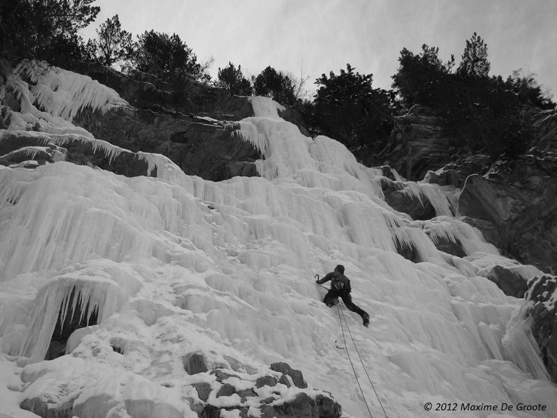 Afgelopen week hebben Maxime en ik (Olivier De Deken) eindelijk kunnen toegeven aan de non-verbale smeekbede van onze gloednieuwe Nomic-ijsbijlen om gebruikt te worden. Door het traag op gang komende ijs-seizoen hebben we moeten zoeken naar goed ijs, uiteindelijk bleek dat we ons daarvoor naar de Ecrins moesten begeven. En meer-bepaald naar L’Argentière-la-Bessée. Het moto dat we ons hadden voorgenomen voor deze paar dagen, was “nice and easy”, kwestie van te wennen aan de nieuwe ijsbijlen. Daarom hadden we ons oog laten vallen om afgelopen woensdag te beginnen met ‘capitaine courageux 200m-III/4+’. Helaas dachten de wegen er anders over, daar we ons onderweg naar de parking (vanwaar het nog 1h15 aanlopen was) hebben vastgereden. Na een redelijk hachtelijke rit in achteruit hebben we besloten om dan maar een eenvoudig te bereiken waterval te klimmen. We kregen ineens een lesje in bescheidenheid, want het ijs was super hard, de bijlen toch nog behoorlijk vreemd, waardoor ‘La vision de Marco 100m-II/3’ toch moeilijker werd dan verwacht…