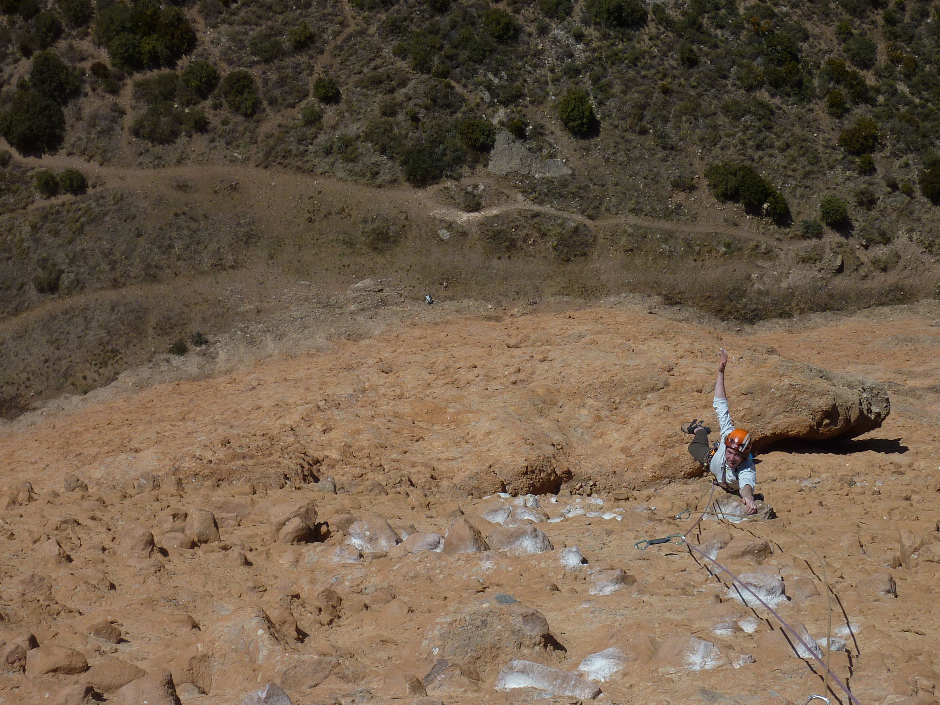 Onze eerste Multipitch-stop is hier, in Riglos. Mijn Blaasontsteking waar ik al 3 dagen last van had bereikte gisteren zijn hoogtepunt met spasmen in de urineleider:)….maar bon met de nodige pillen zijn die problemen nu eindelijk van de baan. We klommen 2 routes : El Tucan Ausente(7a+ 300m) en een combinatie van Supercrack en zulu demente(7b 300m) Veel valt er over de stijl in Riglos niet te zeggen. Lange lengtes, bakken en redelijk overhangend, ambiance verzekerd!!!!