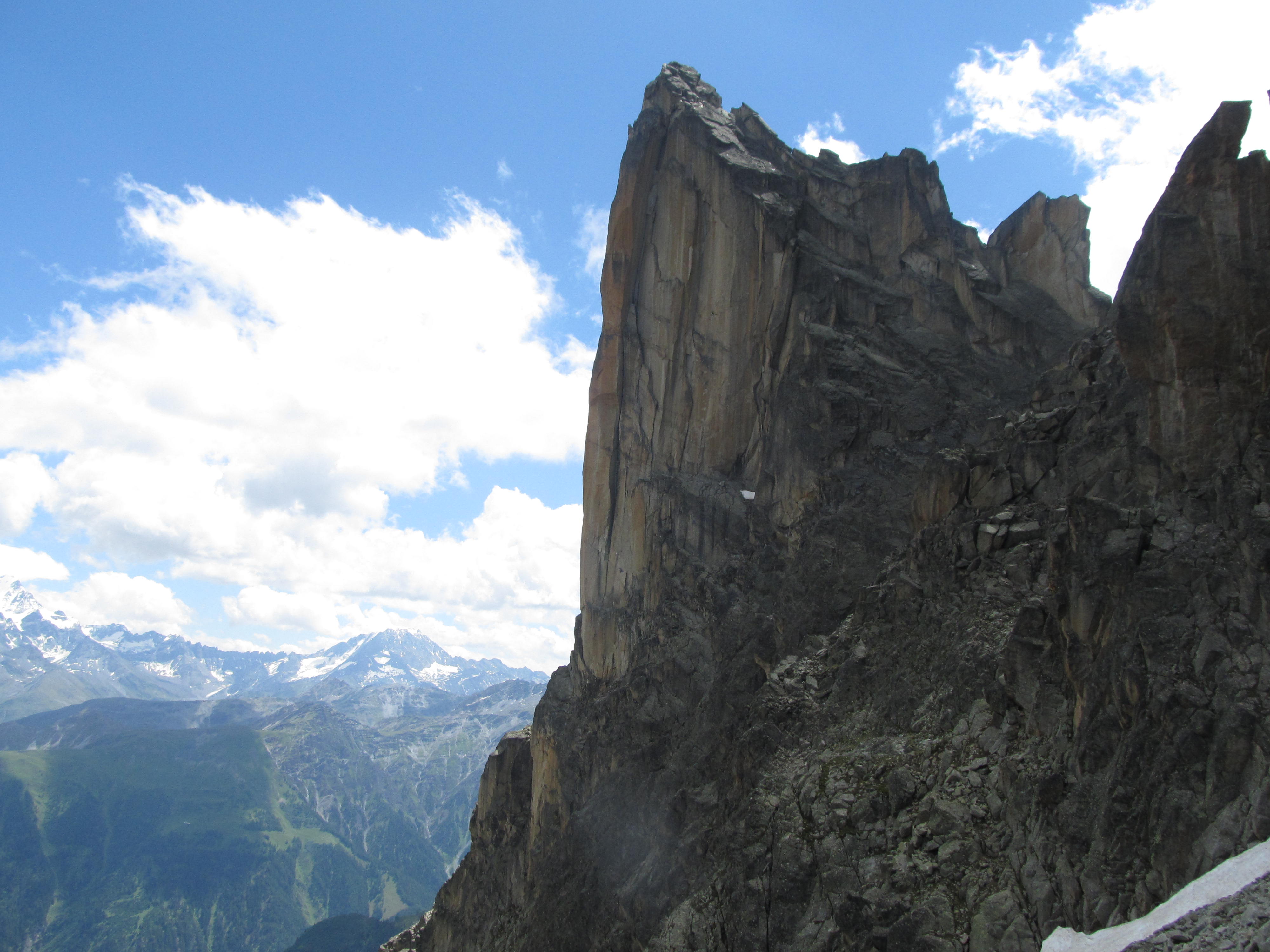 Omdat we hier in Chamonix zonder auto zijn moesten we dus al liftend tot in Praz de fort geraken. Dit keer hadden we geluk. Net aan de grens in “le chatelard” werden we opgepikt door Lucien Abbet, een sympathieke zwitser die een goeie 30 jaar geleden enkele routes heeft geopend op de Petit Clocher. Zelfs is hij duidelijk een grote fan van het barstklimmen en als we hem vragen welke route we zeker moeten klimmen dan is het wel….Etat de Choc.