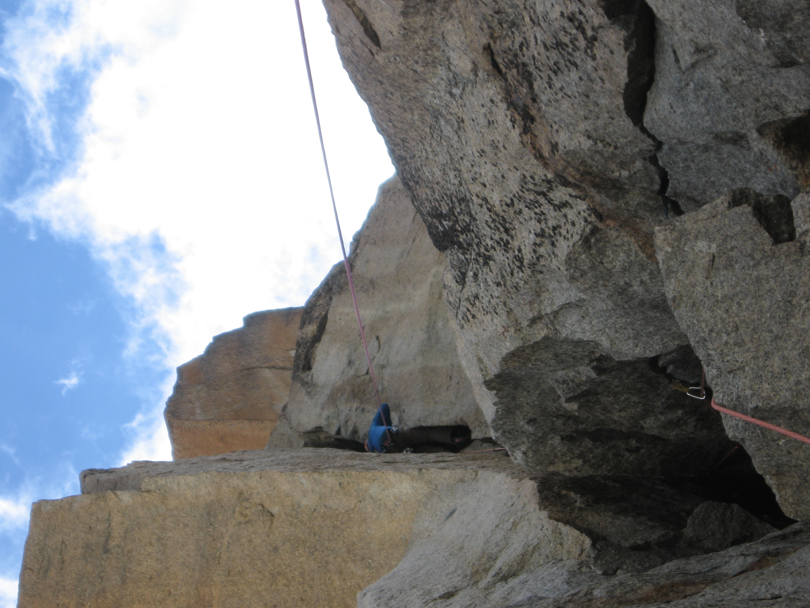 De lijn volgt echt een serie van magnifieke barsten tot boven en ergens in het midden van de route moet je ook door een soort van Chimney,…. en daar ging het even mis!!! Ik was net iets te diep in de chimney gekropen, en het “point of no return” een bultje waar mijn achterwerk te breed voor is was ik ook al voorbij. Godmiljaarde… met men benen vrijhangend, mijn armen uit de barst maar mijn gat muurvast geklemnd tussen 2 rotswanden. Krijsend en brullend als een varken dat geslacht werd kon ik me na een half uur eindelijk bevrijden uit die ongemakkelijke situatie.