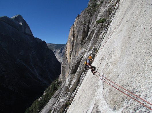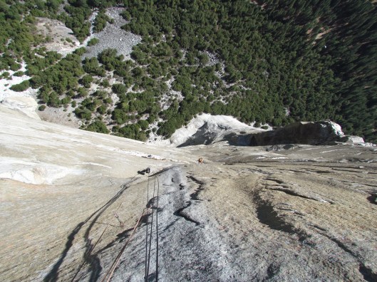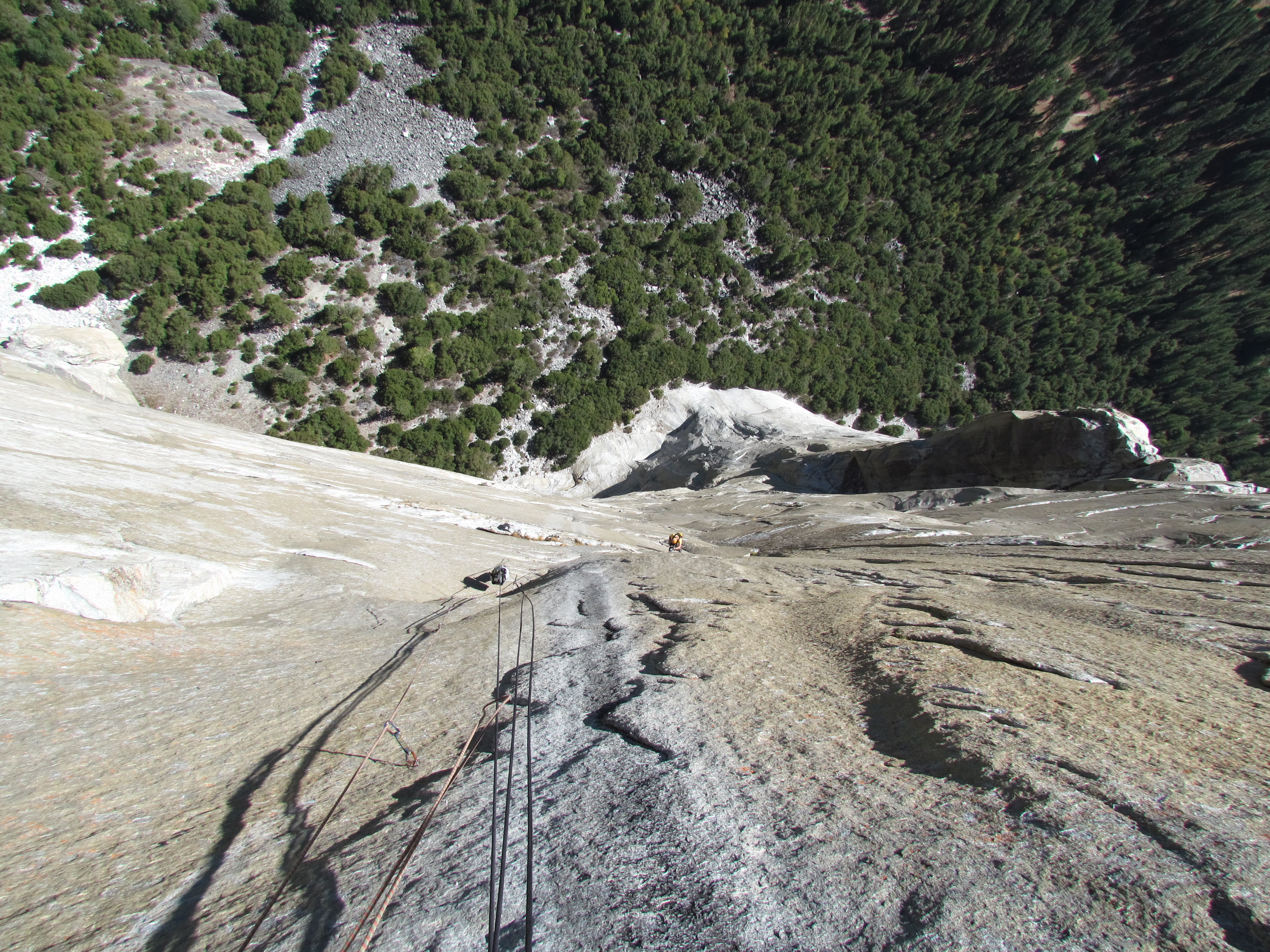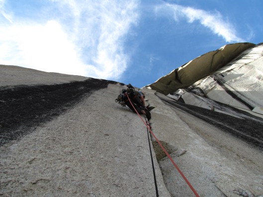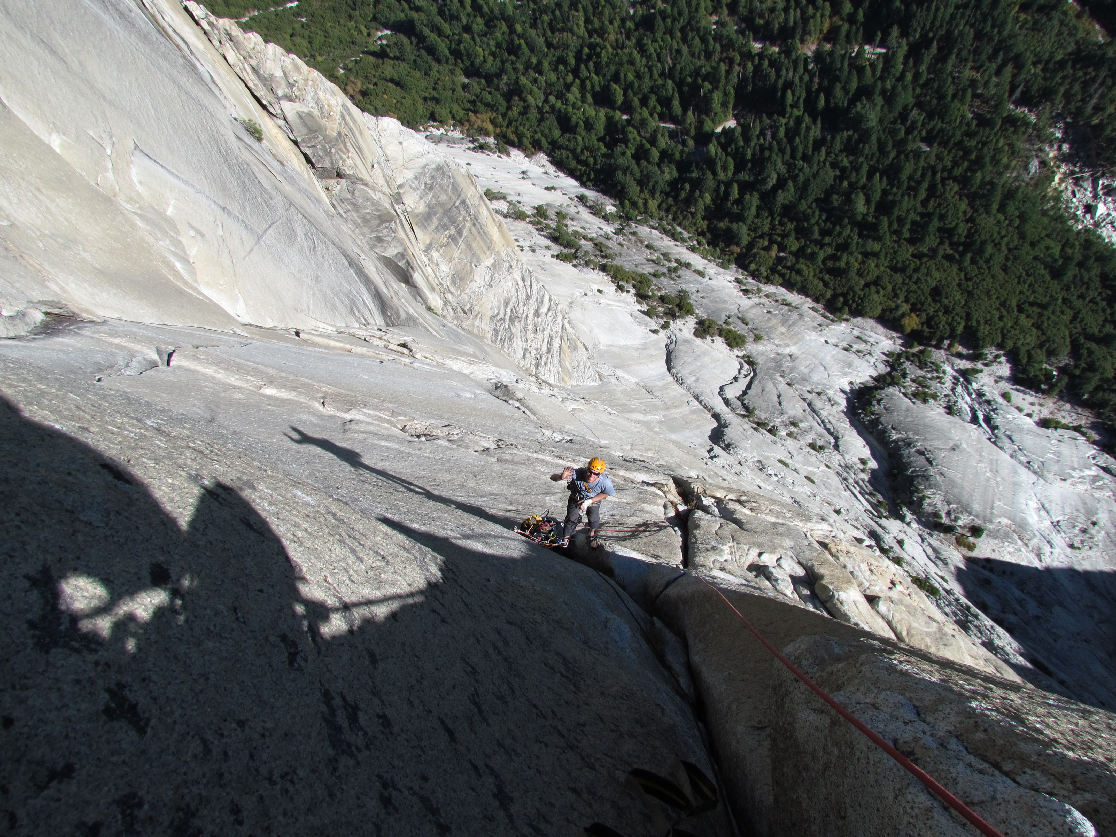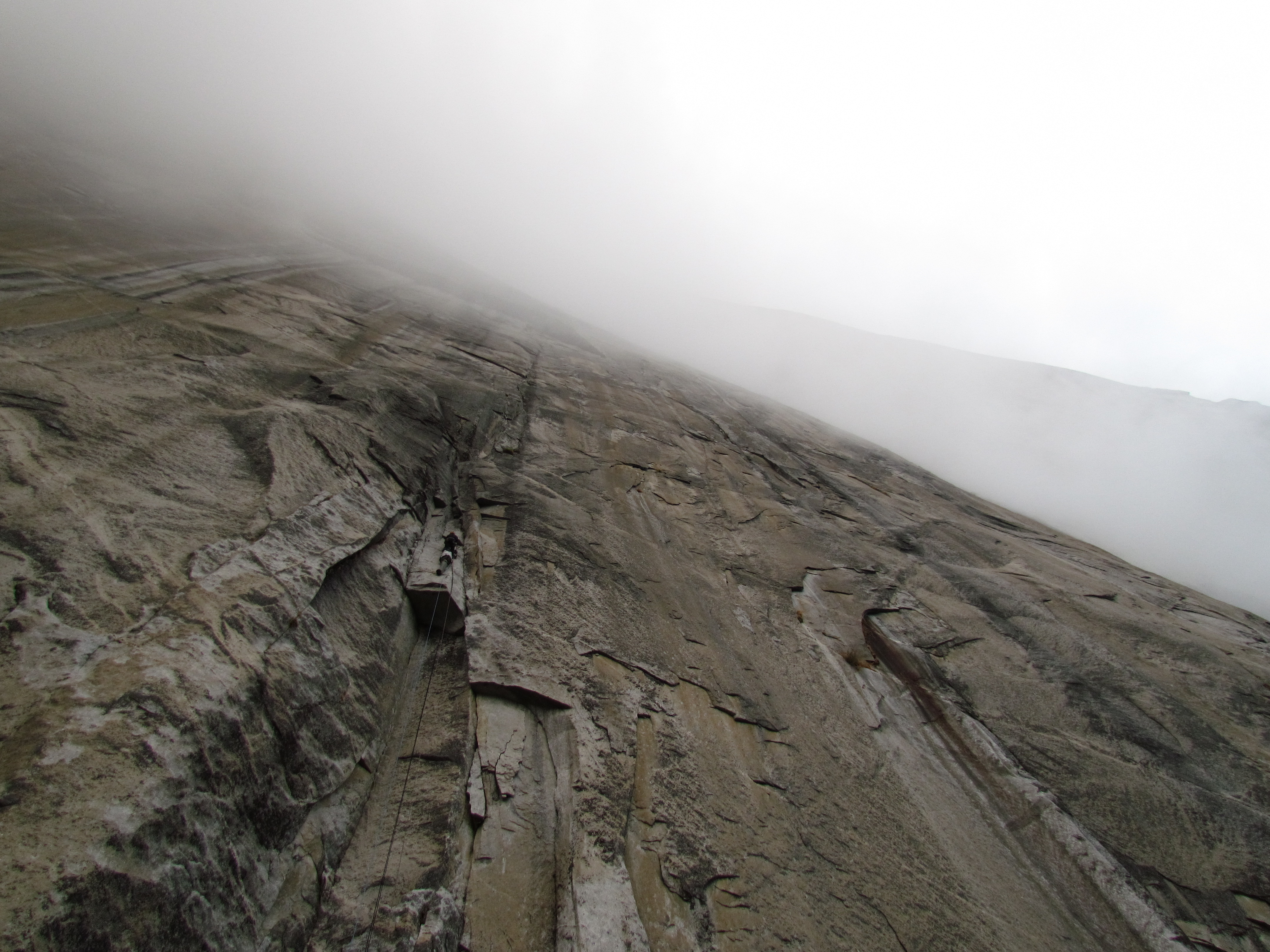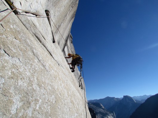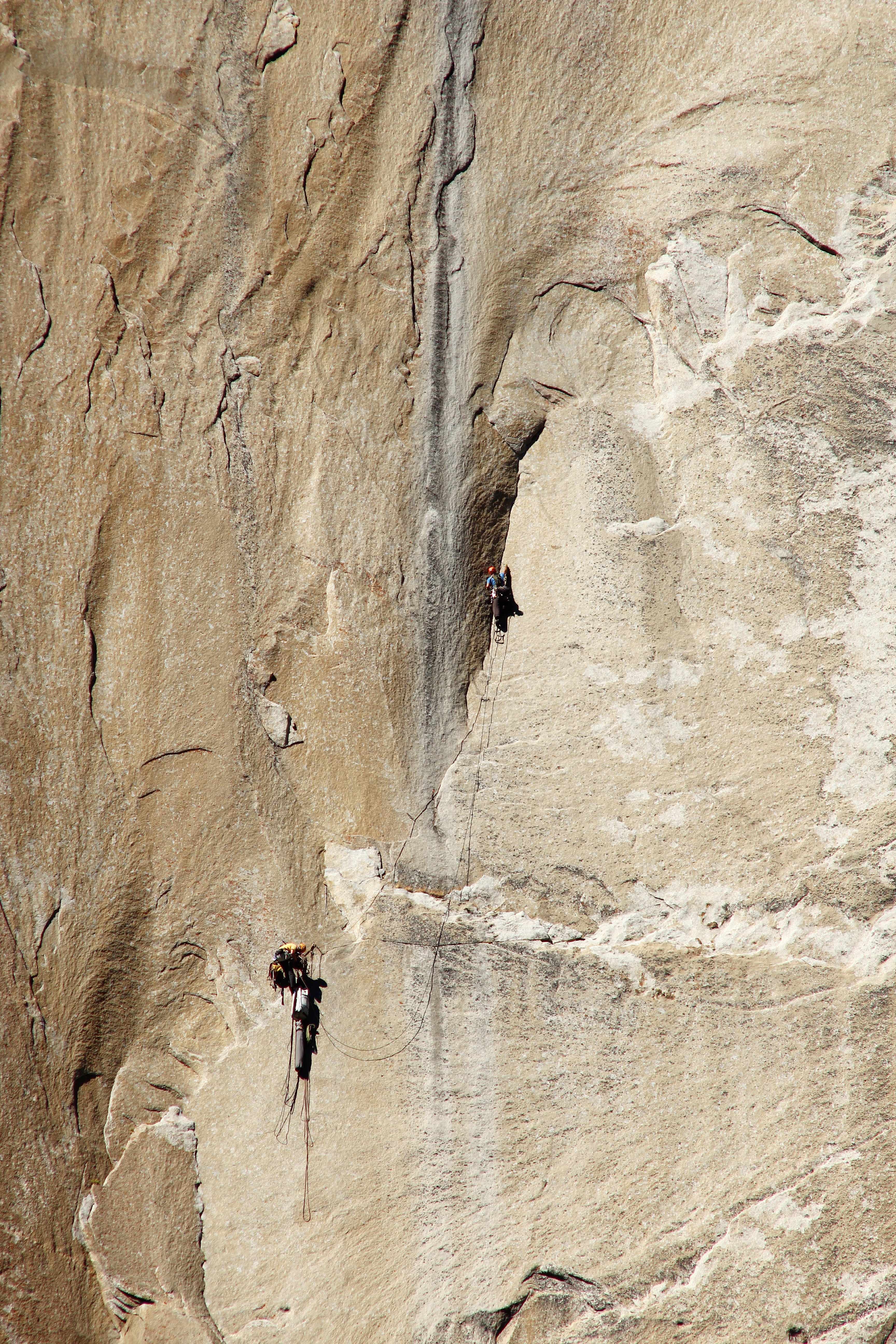Na een laatste nacht in Camp4, vertrekken we vroeg met de laatste benodigde voorraden en bijkomend aangepast materiaal voor “Mescalito” en we jumaren tot bij onze haulbag en portaledge. Vanaf hier kan het echte werk beginnen. We hebben eten en drinken mee voor vier tot vijf dagen in de wand, alles mooi verpakt in één haulbag en de portaledge. De topo geeft voor deze route 6 tot 7 nachten in de wand, als we willen toekomen met onze voorraden moeten we goed doorklimmen. We hebben wel geluk, de eerste 8 lengtes boven ons is er niemand, pas hoog boven ons zien we twee teams hangen. Ook onder ons is er voorlopig niemand, we kunnen dus op ons eigen tempo klimmen.