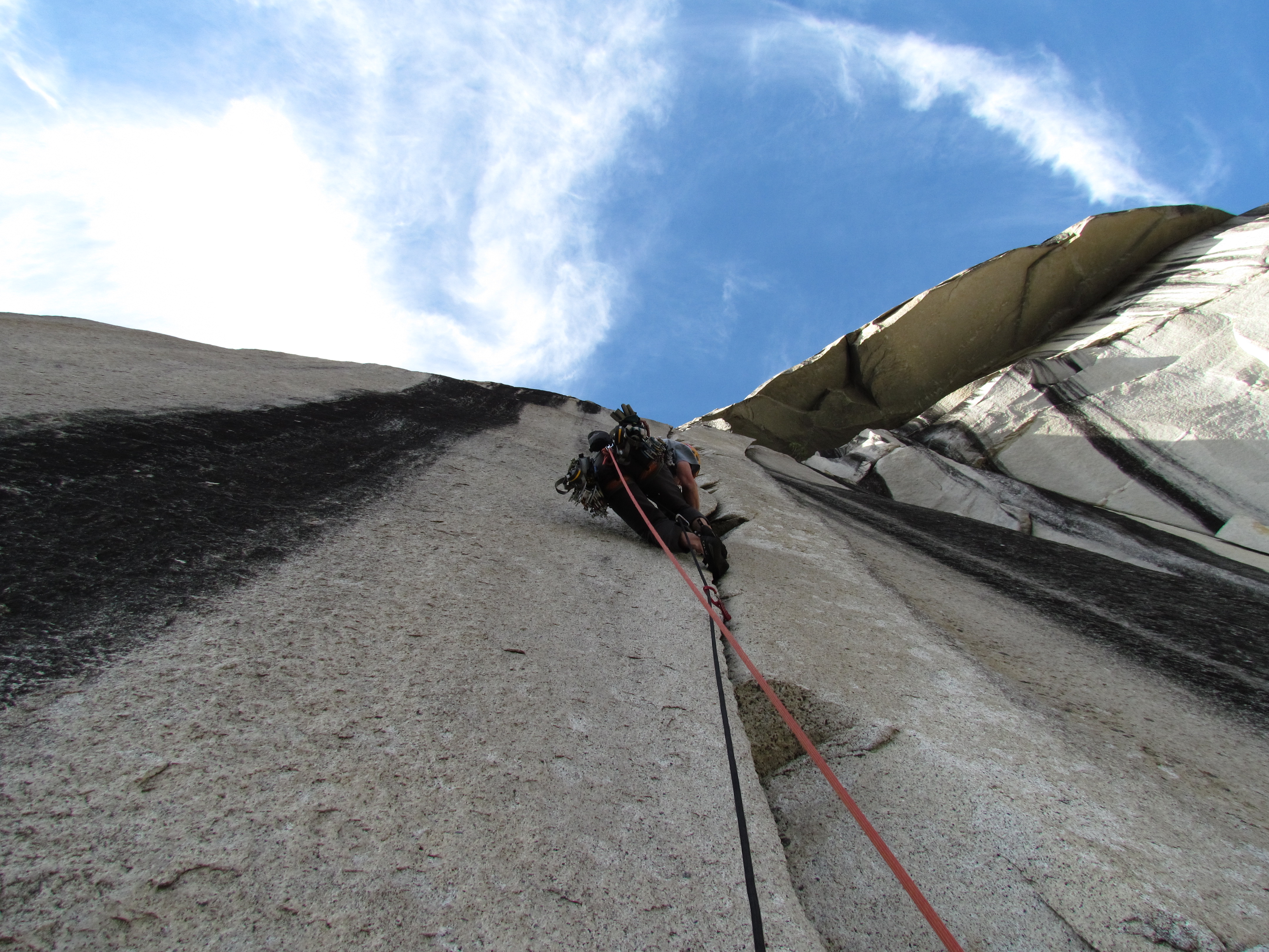 De nacht wordt opgeluisterd door een prachtige sterrenhemel en het bezoek van meerdere knaagdieren. De volgende ochtend beginnen we vroeg aan de eerste touwlengtes, een raar begin met eerst 250m klimmen, dan drie lastige pendules, om uiteindelijk pas op de tweede relais aan te komen, weer af te dalen tot aan de start en daar de haulbag aan te haken, terug opjumaren en de haulbag omhoog halen. Pfioew, ruim drie uur bezig om 50m hoogte te winnen… Gelukkig gaat het daarna wat vlotter, we klimmen zoveel mogelijk lengtes vrij en halen de laddertjes pas boven als het echt te moeilijk wordt. Met vrij klimmen tot 5.10 en artif tot C2+ komen we goed aan onze trekken. De eerste goede bivakplaats, het “Watkins Sheraton”, slaan we over en we komen opnieuw in het donker aan op een goede richel op de 11e touwlengte. Een lange maar geslaagde dag met 11 touwlengtes, een goed begin!