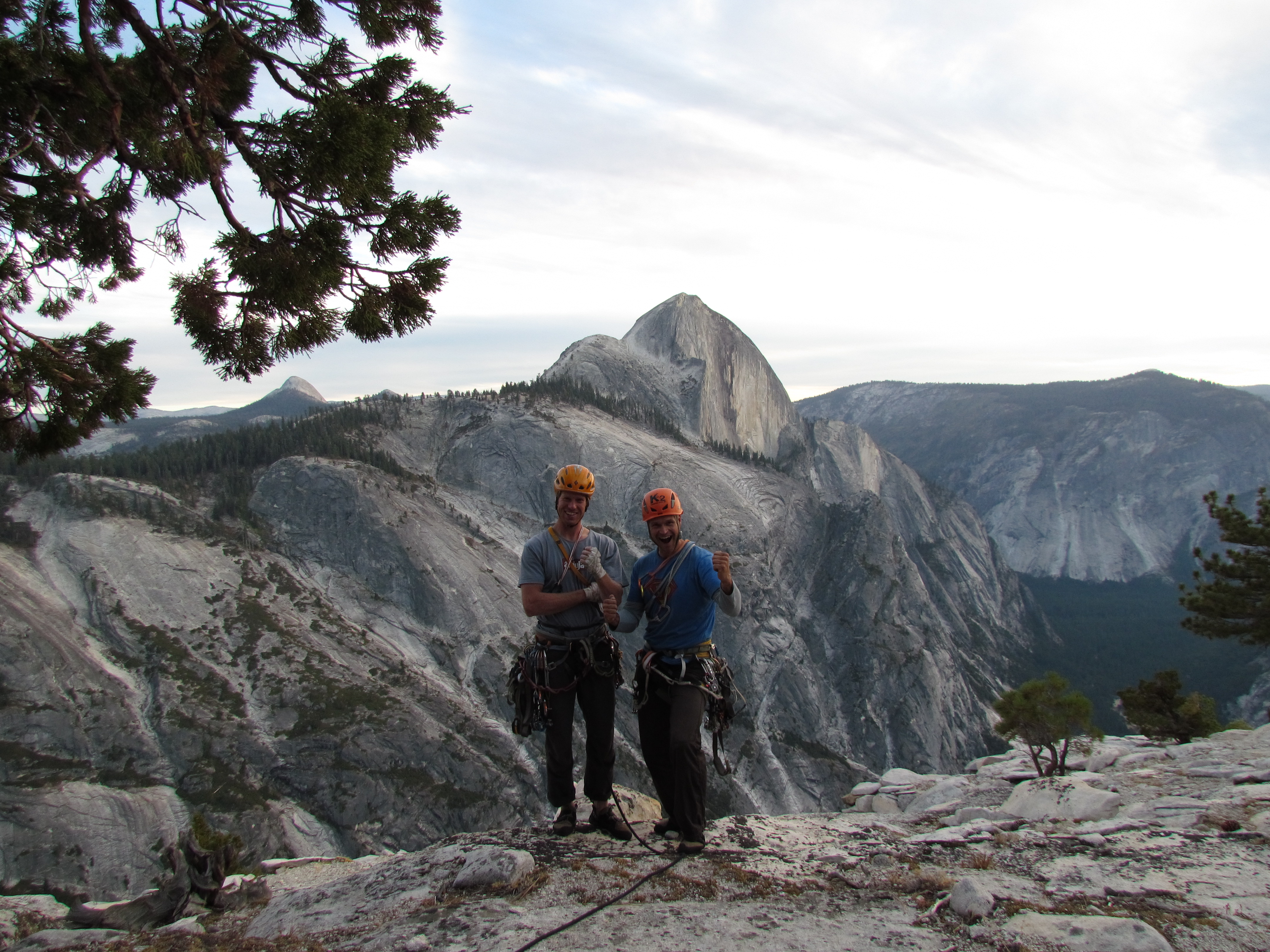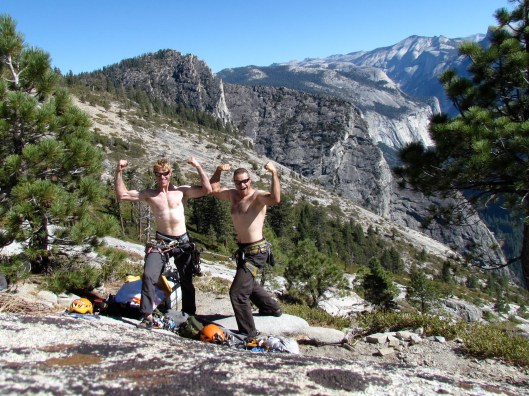 Na een laatste lui ontbijt in de ochtendzon, klimmen we uit. De laatste touwlengte is nog bijzonder lastig, ik vlieg er ook nog eens uit op een lastige C3-placement. Maar tegen de middag staan we op de (teleurstellend vlakke) top van El Cap! Nu nog een vervelend detail, de afdaling…