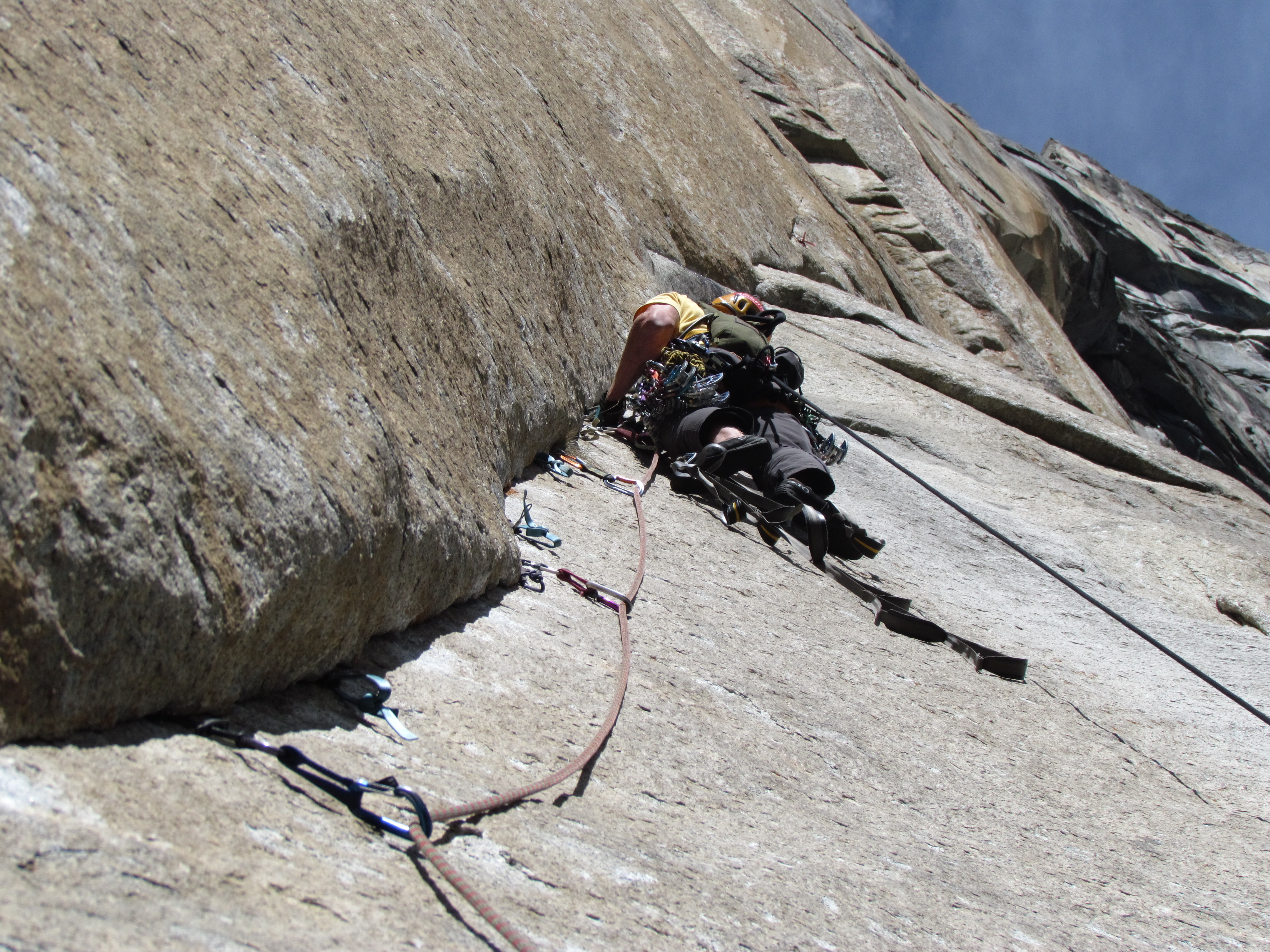 Vierde dag in de wand, kunnen we vandaag uitklimmen? Nog maar 7 lengtes te klimmen, dat moet haalbaar zijn. Het technisch klimmen blijft moeilijk, maar door de opgedane ervaring van de afgelopen dagen, gaat zelfs de meest spannende “bad fall potential” relatief vlot. Stijn doet nog wat airmiles, nadat notabene een gele friend eruit floept, maar hij klimt onverstoord verder. Wanneer we in de namiddag nog maar drie lengtes onder de top zitten, horen we muziek. Eén lengte verder zitten we geblokkeerd achter een team dat twee dagen voor ons vertrokken is, met een chaos van haulbags, portaledges en natuurlijk een ghetto-blaster… “Ow, you must be those fast Belgians, catching up on us”. Yep, that’s us ;-) Leuk om te horen, dit team had die informatie van Tom Evans op de grond, maar daar gaat onze kans op de top voor vandaag. We laten het niet aan ons hart komen en installeren ons op R23, een comfortabele maar aflopende richel en we fixeren nog tot R24. De volgende dag rest ons nog 2 lengtes te klimmen en dan zijn we boven.