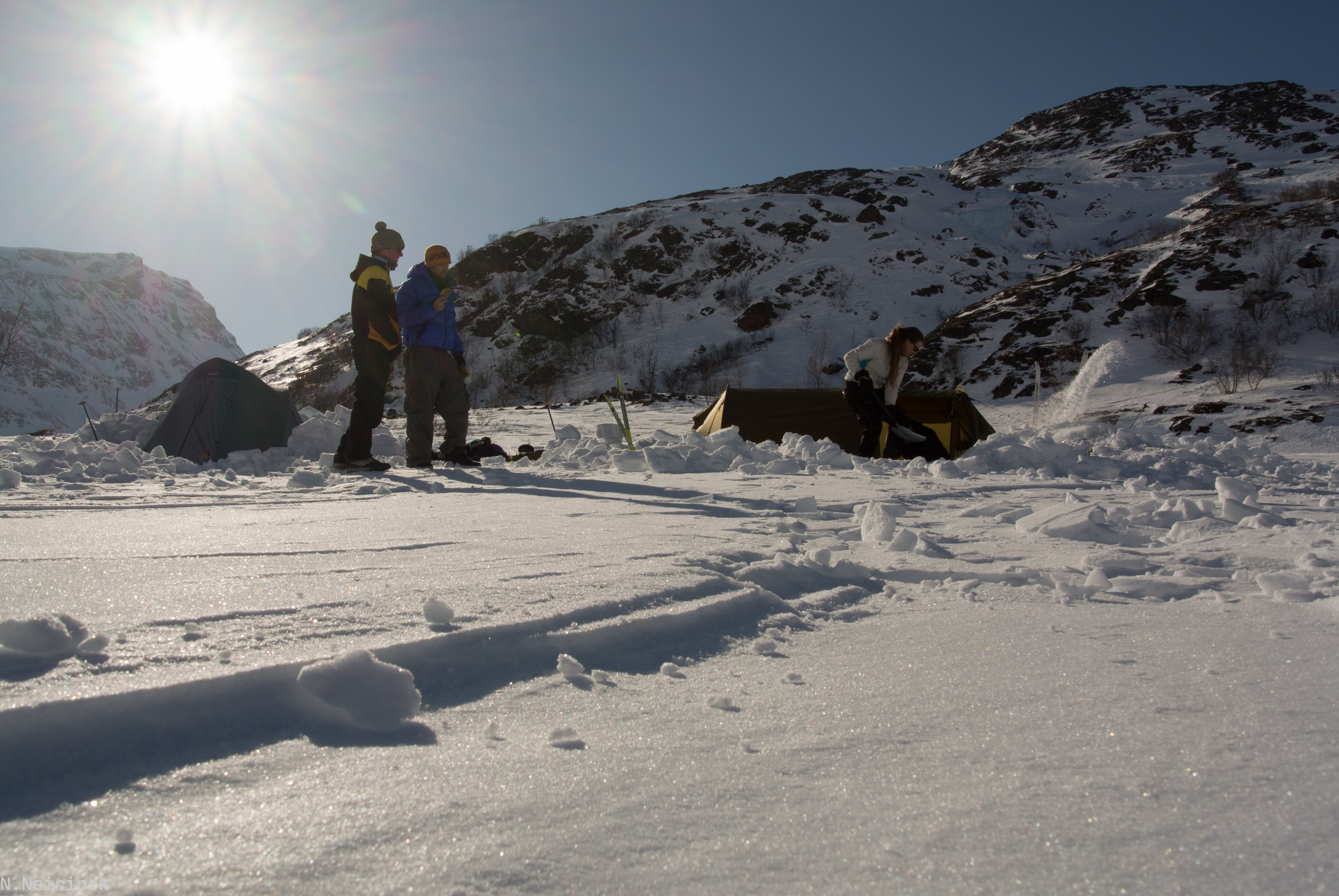 Spiterstulen is een complex van een viertal grote hutten en ligt aan de voet van de hoogste berg van Noorwegen (de echte hoogste). Galdhøpiggen is met zijn 2469m een kleine kop groter dan zijn buren in het Jotunheimen massief. Ken-Roger sloot zich aan bij “Team-Awesome” en met z’n vieren zetten we onze tenten op in het sneeuwveld aan de andere kant van de rivier. Niks leuker dan met grote brokken sneeuw een kasteel te maken van je tent…