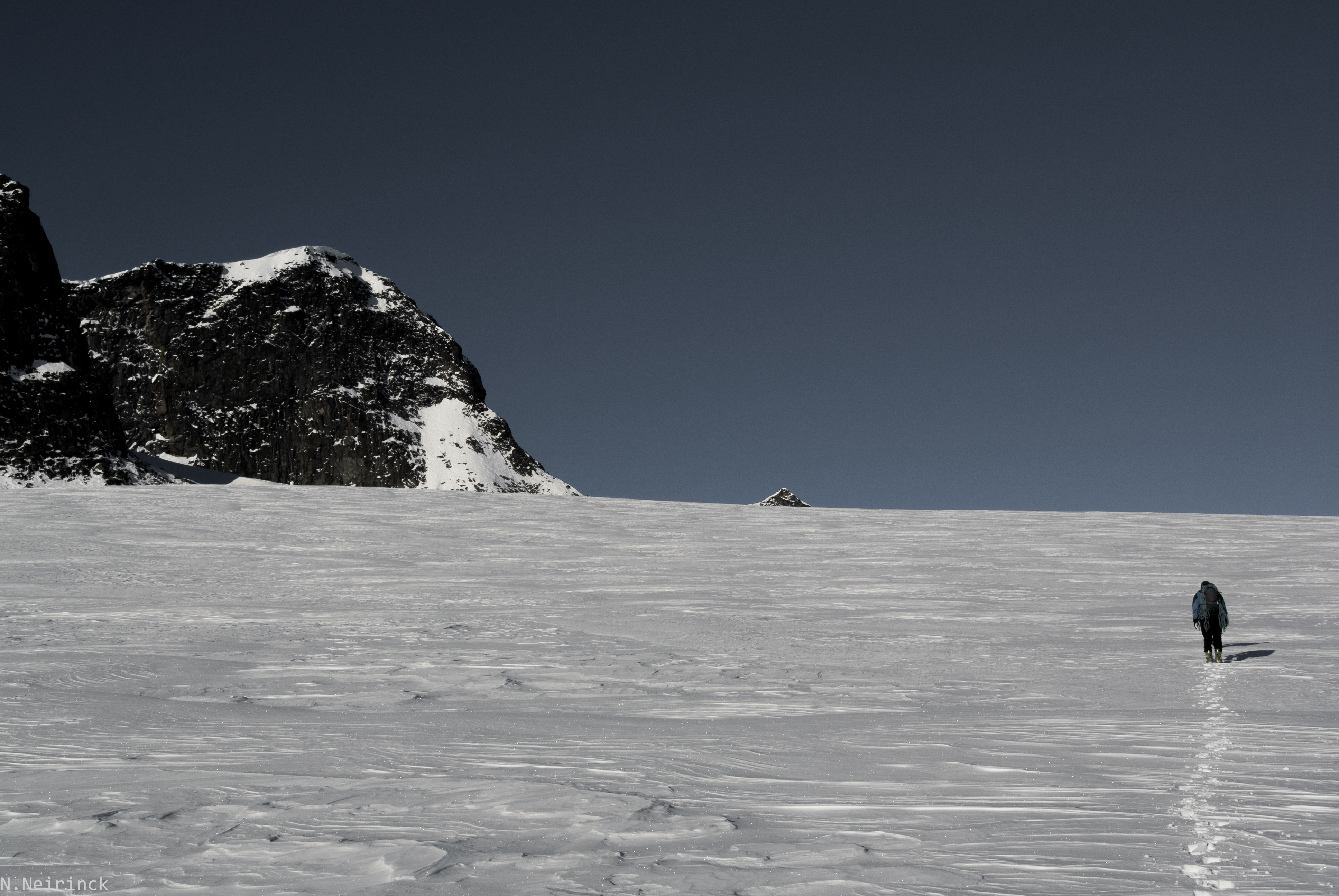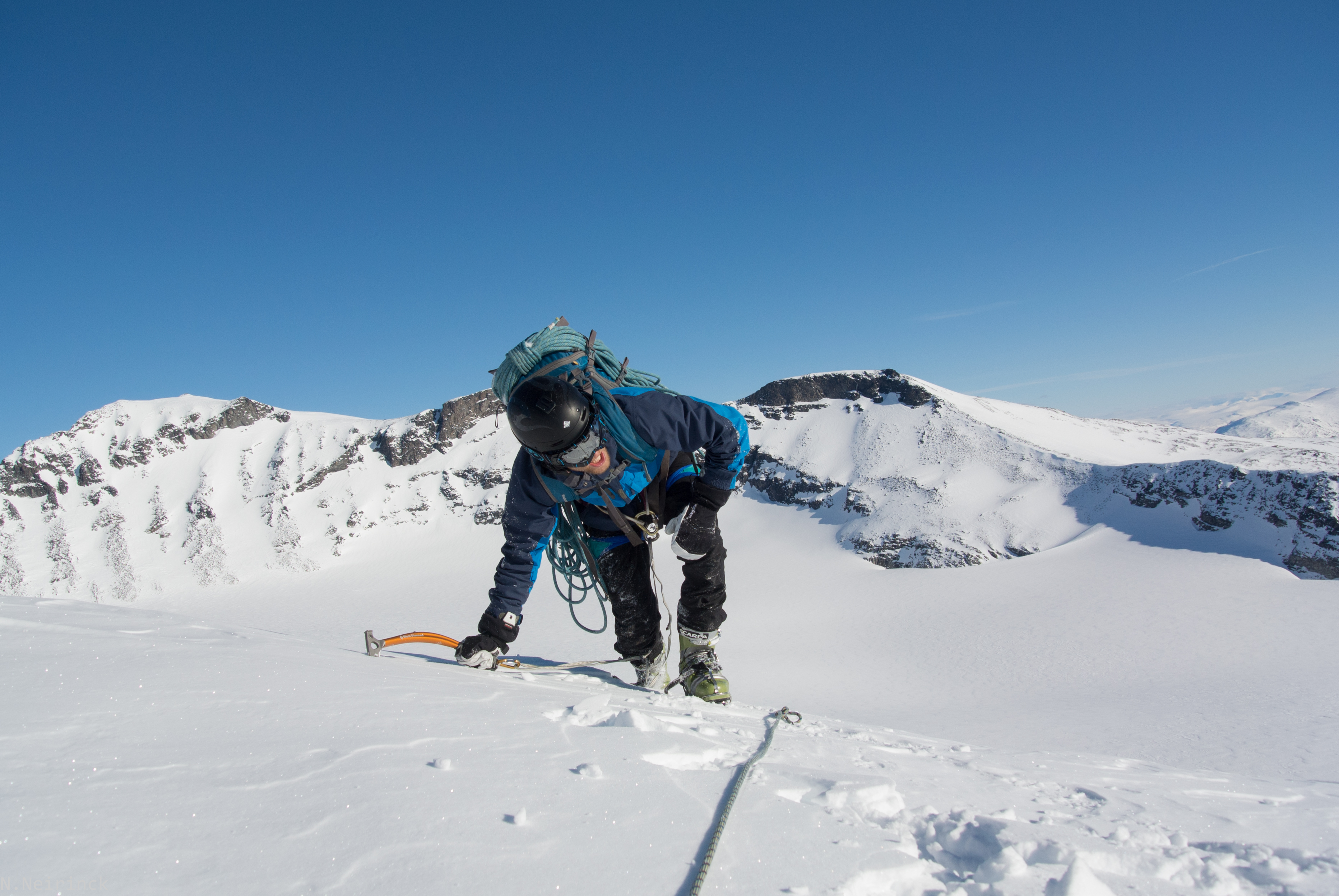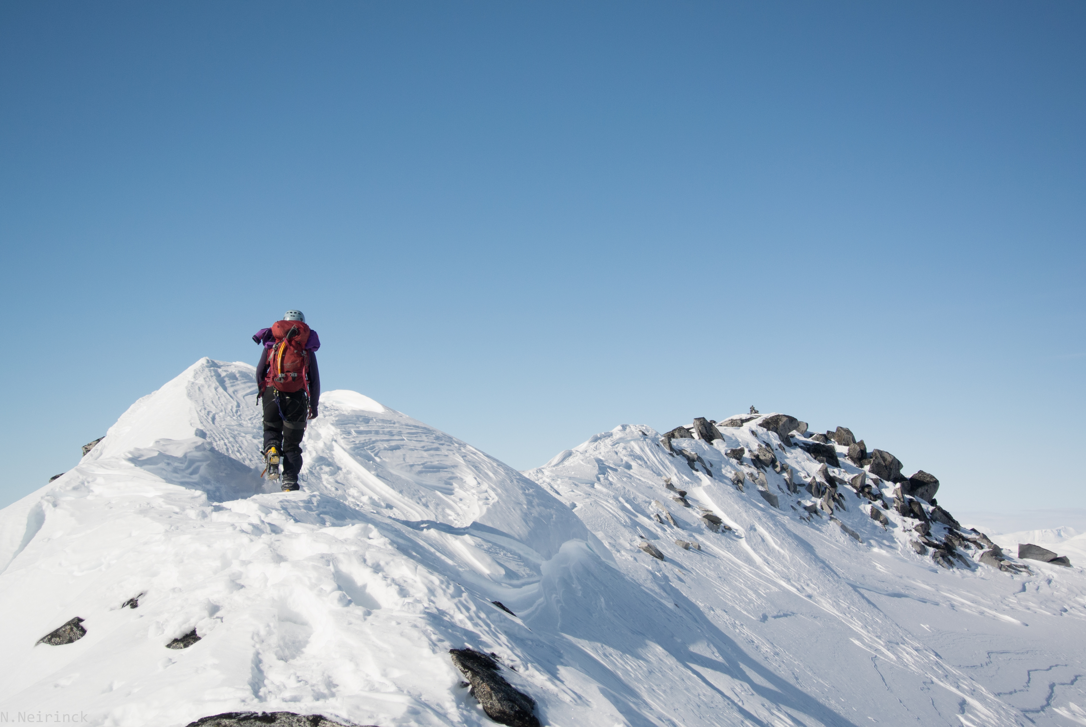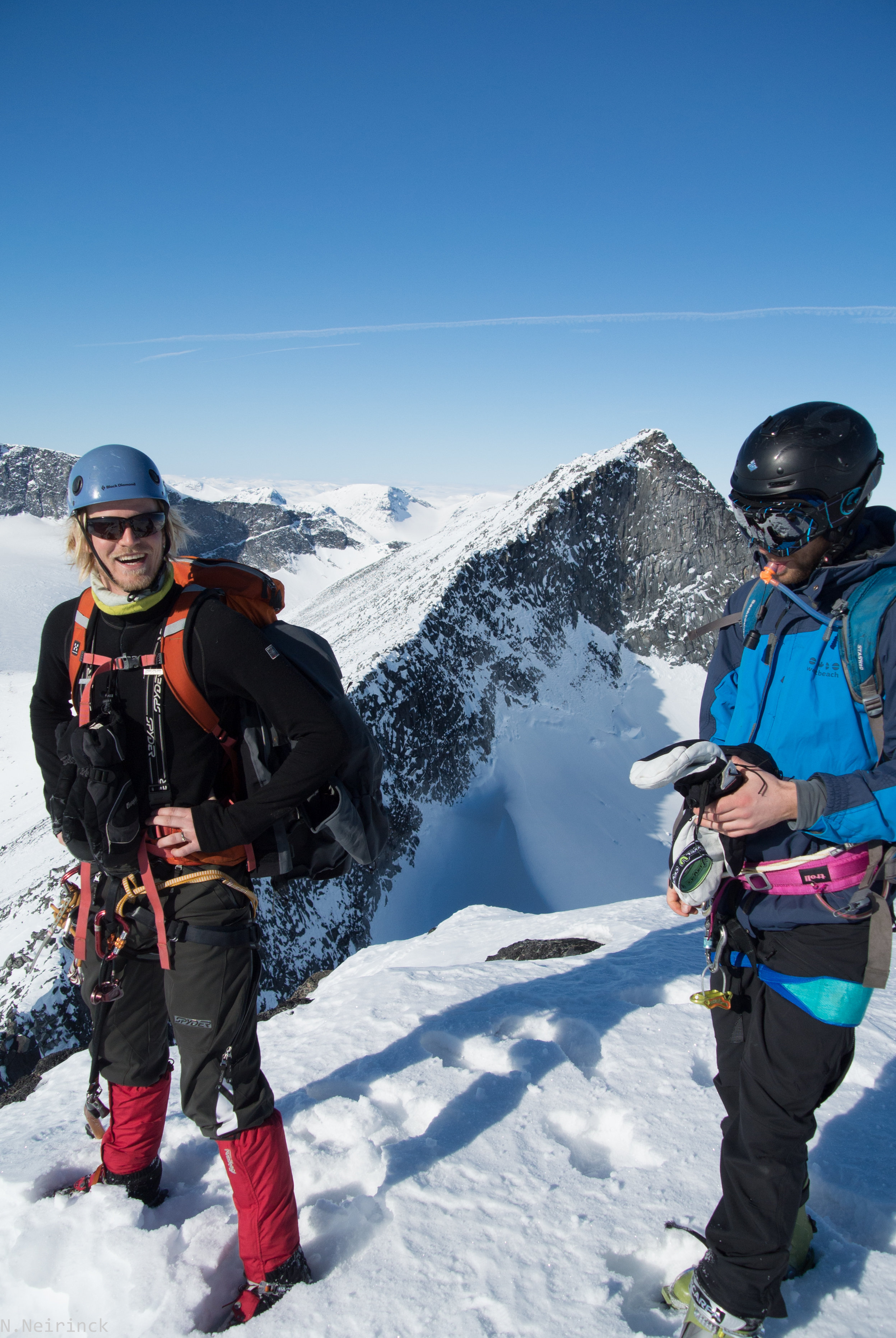 Een kleine erg luchtige traversee over losse sneeuw vraagt ons om nog even in te binden. Gelukkig spreken we hier beter af dan op Ymmelstinden, en al snel zijn de laatste moeilijkheden overwonnen.