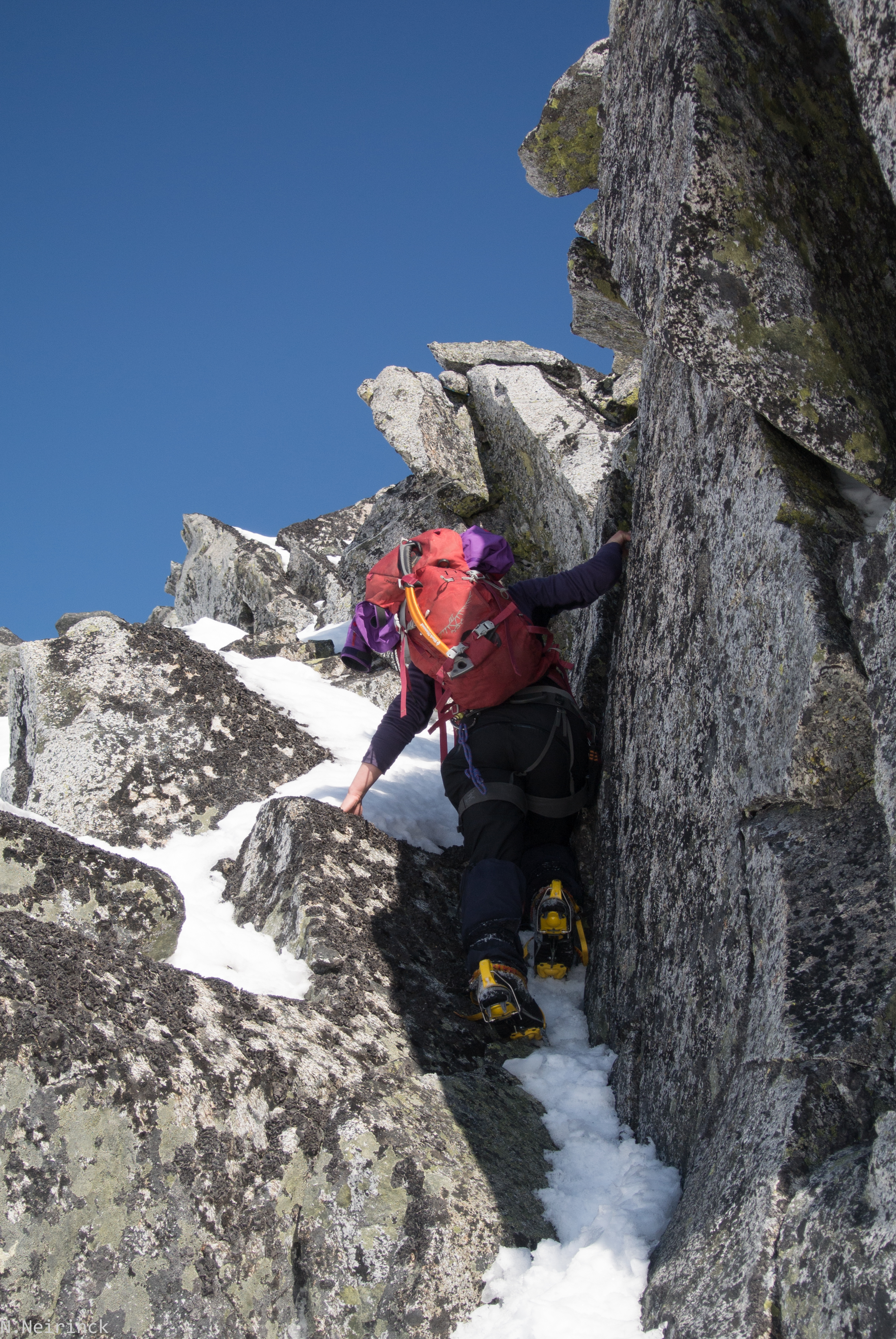 Wat volgt is een prachtige graat. Eindeloos lang, vaak erg luchtig, maar ongelooflijk mooi. Daarbij komt nog dat we het niet beter kunnen treffen met het weer: een straalblauwe hemel en geen zuchtje wind.