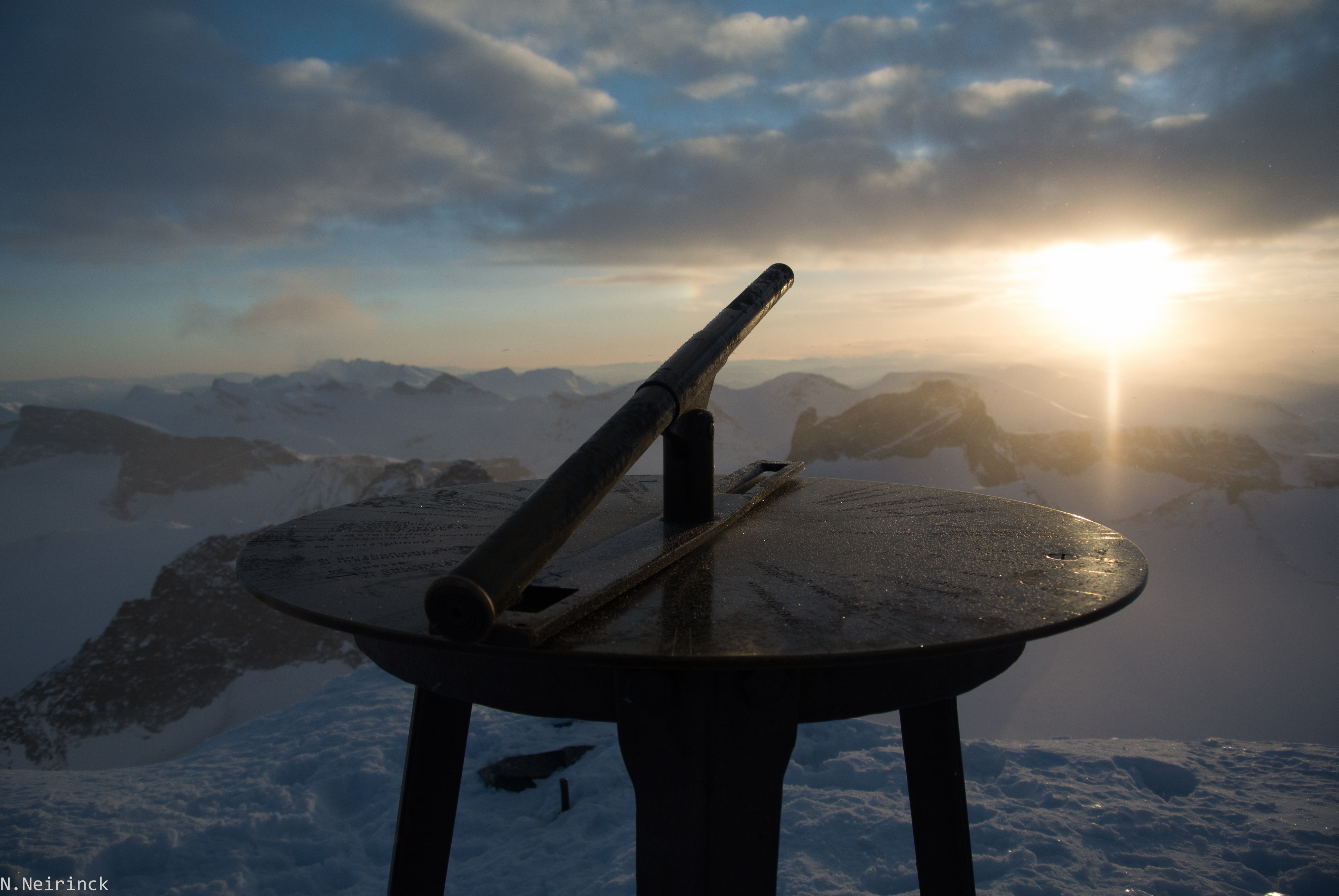 In de ondergaande zon is het uitzicht vanop de top onbeschrijfelijk mooi. Het vreemde hutje waar ’s zomers toeristen zich blauw betalen aan wat frisdrank staat er verlaten en vooral ondergesneeuwd bij. Het betekend echter wel dat we vanaf nu de eenvoudige normaalroute van Galdhøpiggen kunnen afdalen.