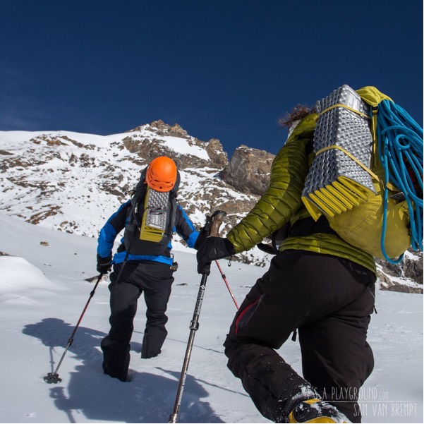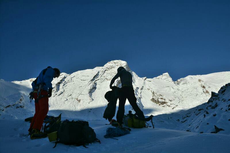 After some cloudy days we headed out for a trip to a supposedly unclimbed peak, for some more of the good old acclimatization. Sadly, even though we were on a south facing slope, we were held back by unsolid powder snow again. This time our bivouac was not ‘bien chaud’ and the little sleep combined with deep snow slowed us down considerably.