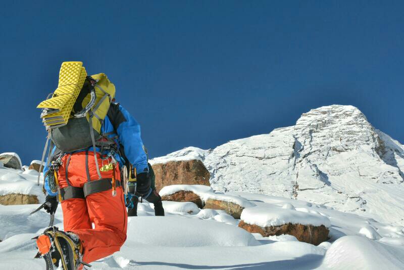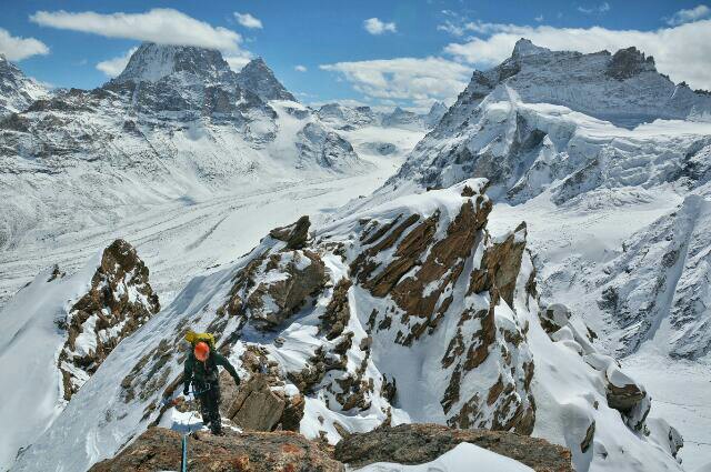 In hindsight, one sunny day is – by far – not enough to solidify half a meter of snow at 5000m. A day of plowing through knee deep snow at that altitude got us up to the ridge too late and, pretty exhausted, we decided to spend the night on a little saddle to climb the arete the next day.