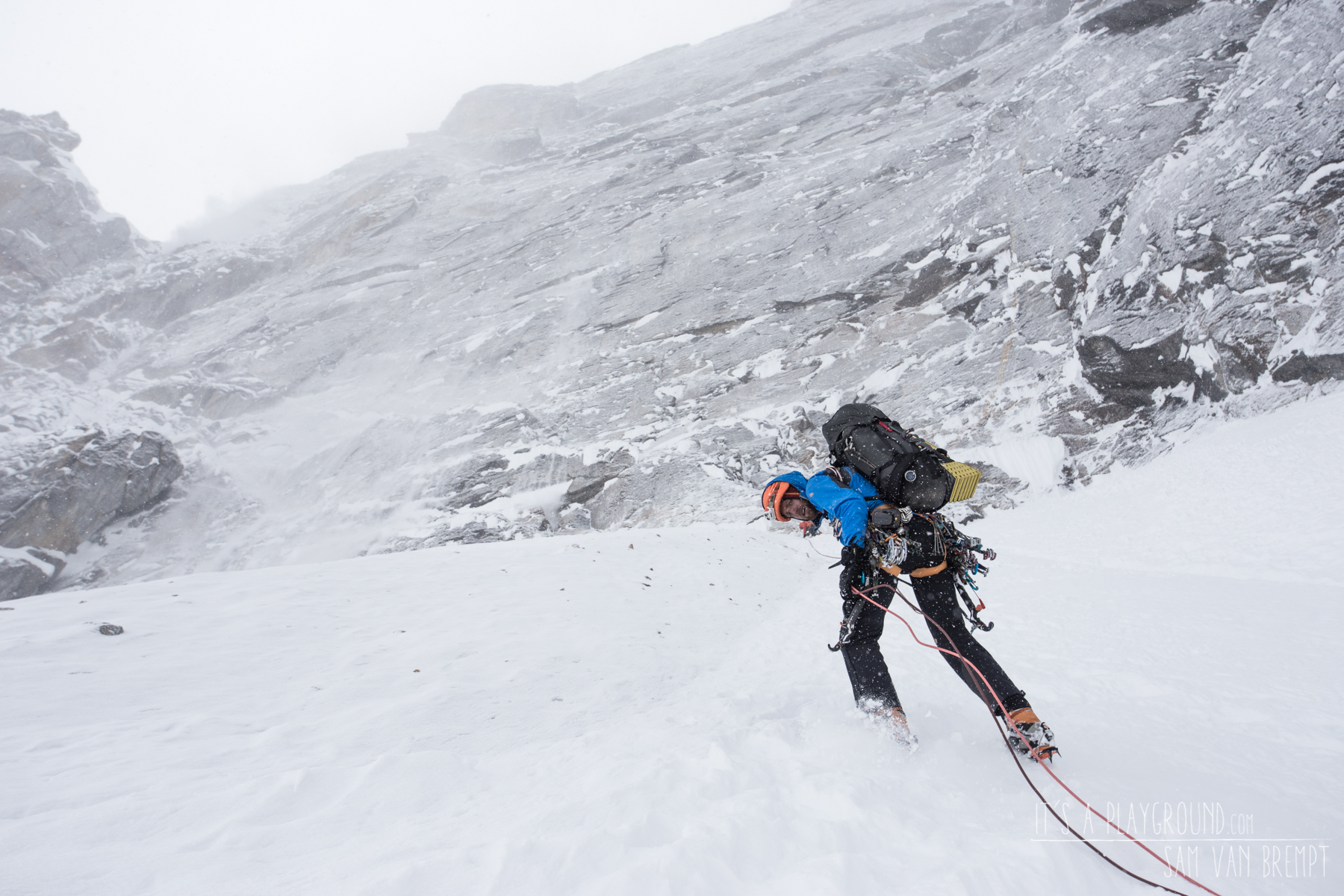 I concluded that the wall must’ve once been two layers of bomber granite held together by a weak layer. The left half of the outer granite layer must’ve come off at one point, leaving the hyper blank wall, with a very weak corner system right next to it. Thumbs up for geology. As I was making up my mind whether or not I would give it a go as well, it started snowing already. We were getting used to the (late)afternoon clouds, and were prepared for a snowy bivy later that day, but now – at only 11 AM – we were already engulfed in thick white mist while thick snowflakes came floating down on us. Screw this, we’re out of here.