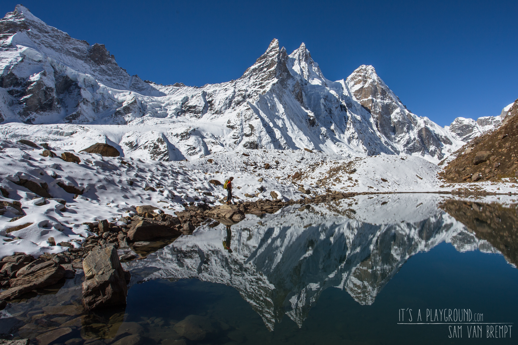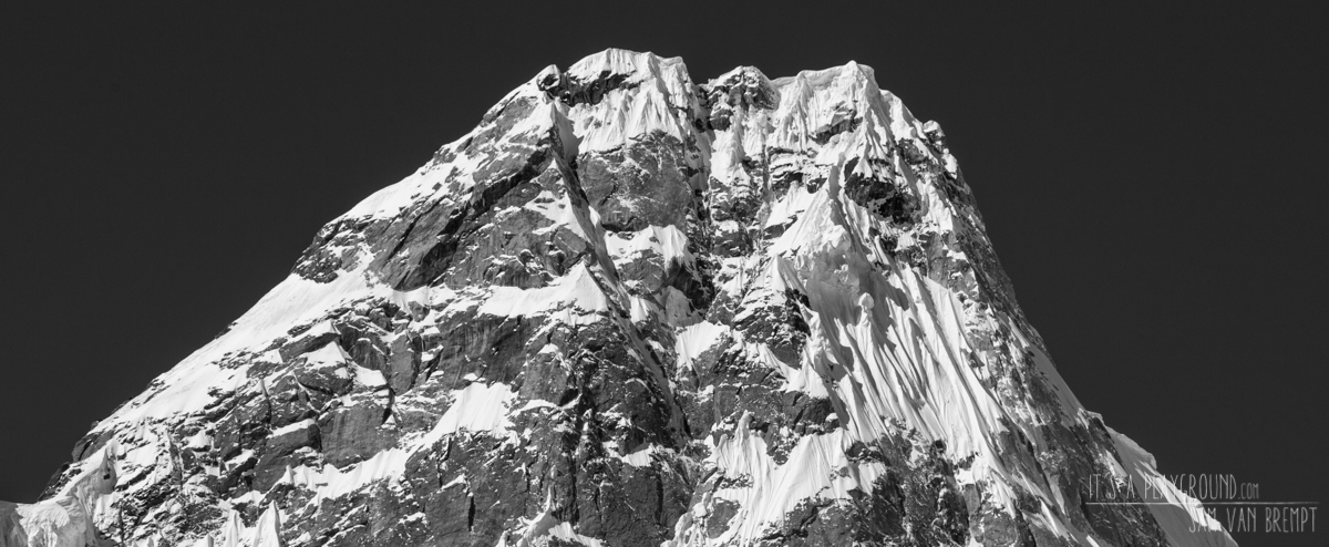 Despite dying from a heatstroke the day went pretty smooth. By now we were getting really good at tracing knee-deep sugarsnow and we got a closer look at the face. Sam got out the big guns and took some close-up shots. We were pretty sure to have found a sick line that went straight through the face. Though quite impressive it looked like the perfect line on an amazing mountain. The stoke was high. Very high. Maybe a little too high as I remember Sam saying “If we manage to climb this, I’ll quit climbing”. Looking back – and looking at all the awesome stories and pictures Sam brings back from the mountains – it might have been for the better that we did not succeed…