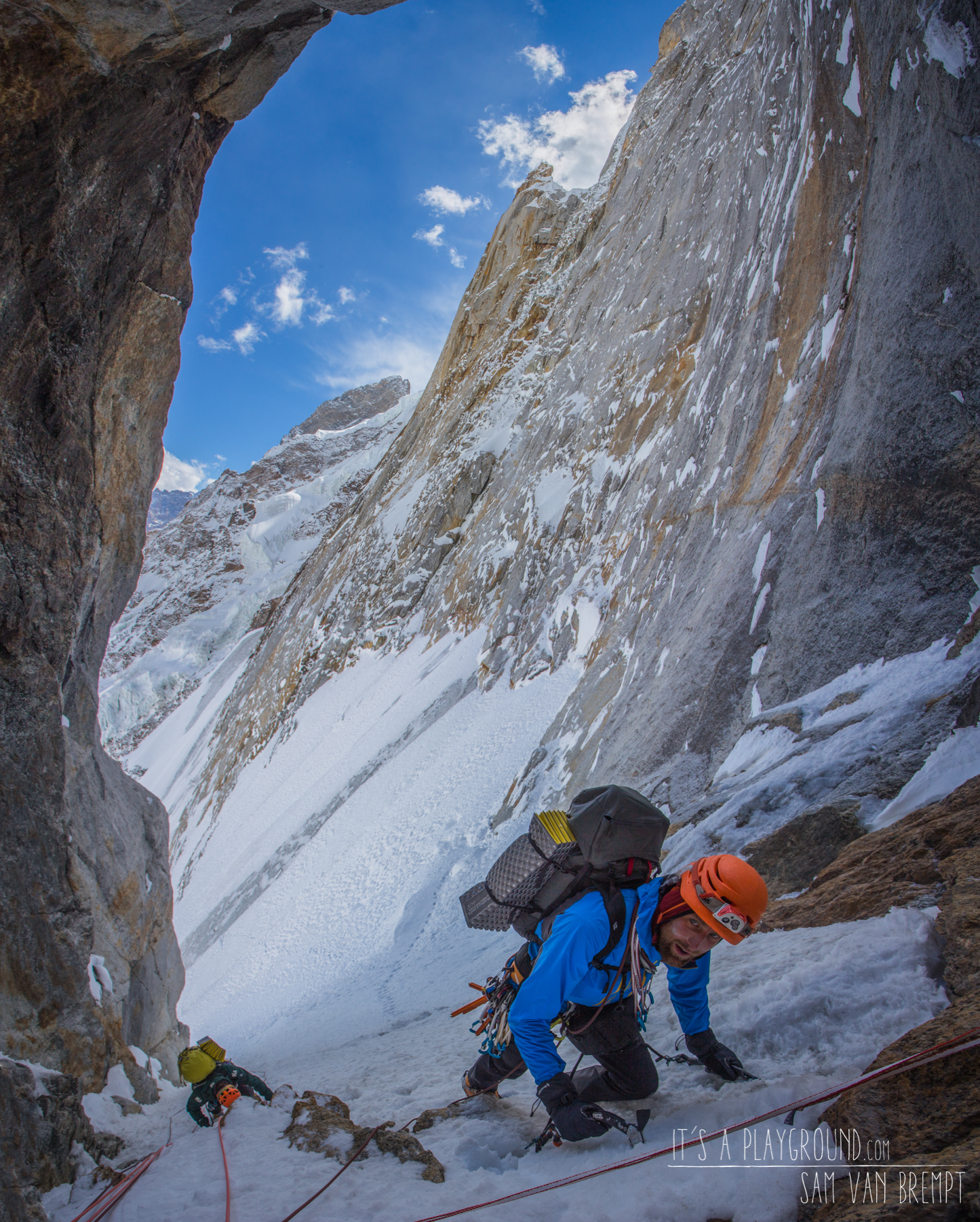 At first light we were at the foot of the wall. We roped up and Sam started to climb our first pitch. He disappeared behind a corner and a few moments later I heard him cheering and giggling. For a moment I was wondering if he had been taking some of the expired antibiotics I had been tripping on two weeks ago, but as soon as I started following I realized why he sounded so excited. Our first pitch was bomber solid, almost vertical ice, flowing under a giant bridge of snow. We had found and entered the gate to Barnaj!