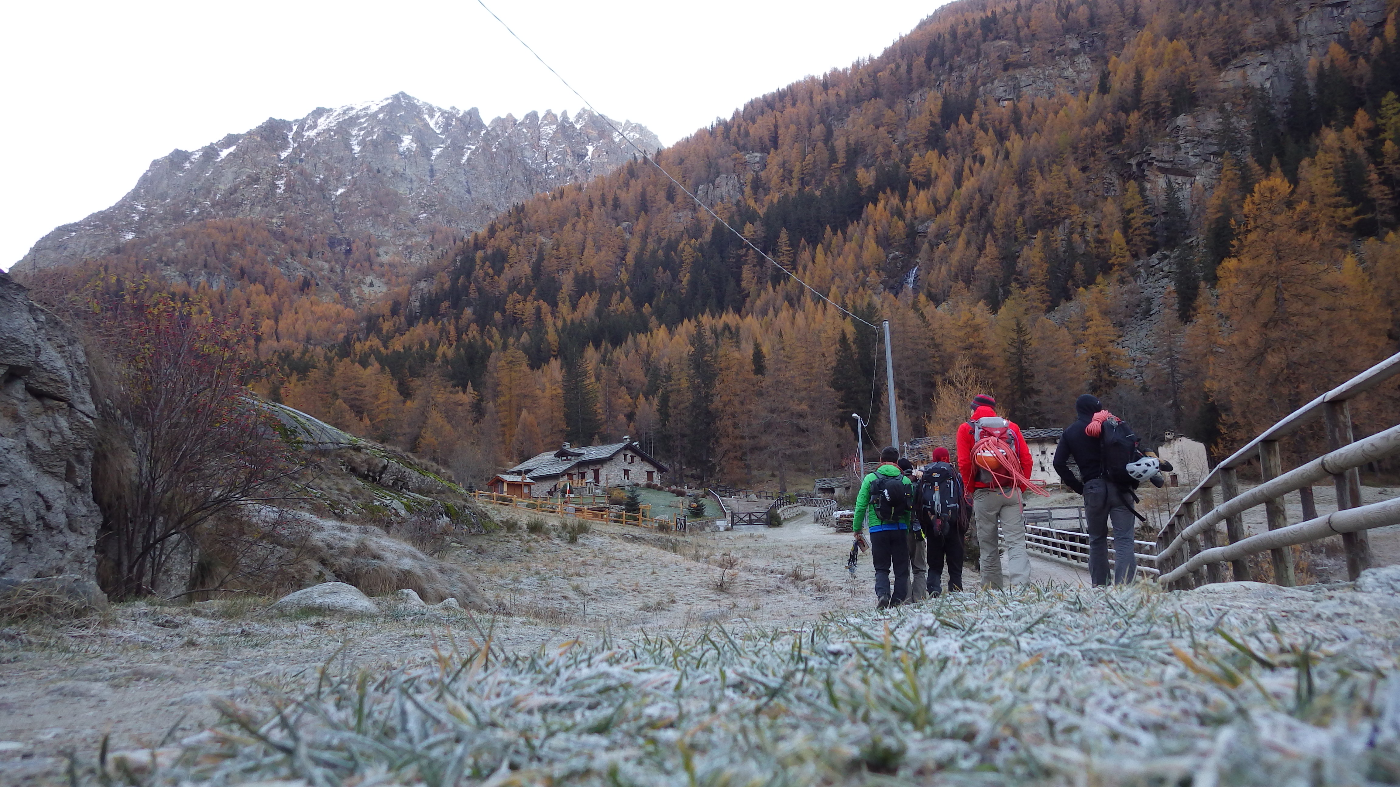 Zaterdagochtend 6u, klaar voor vertrek in Antwerpen. Het Mount Coachbusje werd door Garage Houttequiet van een hemels groot Mount Coachlogo voorzien, schon schon! Klimrugzakken vol noten en vrienden – de betere vertaling van nuts and friends – worden ingeladen. Deze keer hebben we geen halve koffer aan kampeergerief nodig: we slapen in Albergo La Cascata, een superdeluxe herberg in het Italiaanse Noasca, waar ons bedje gedekt en ons eten gekookt wordt. Enfin en route, op een prachtige dag waarbij we onderweg van de herfstige natuur in volle glorie kunnen genieten. Vanuit Martigny naar de Saint-Bernard pas en weer afdalen richting Aosta, een heerlijke omgeving! We komen aan in het donker en zien tegelijkertijd een andere Belgische nummerplaat opdraaien: onze timing blijkt al meteen perfect afgestemd op Steve en Arne, de stagebegeleiders voor de komende week. Ook Denis en Samuel komen wat later aan en zo is het Valle dell’ Orco team compleet. Hoewel, compleet? Helaas niet helemaal; William ligt buiten strijd door een operatie aan zijn schouder en Andreas diende af te haken wegens stevig ziek.