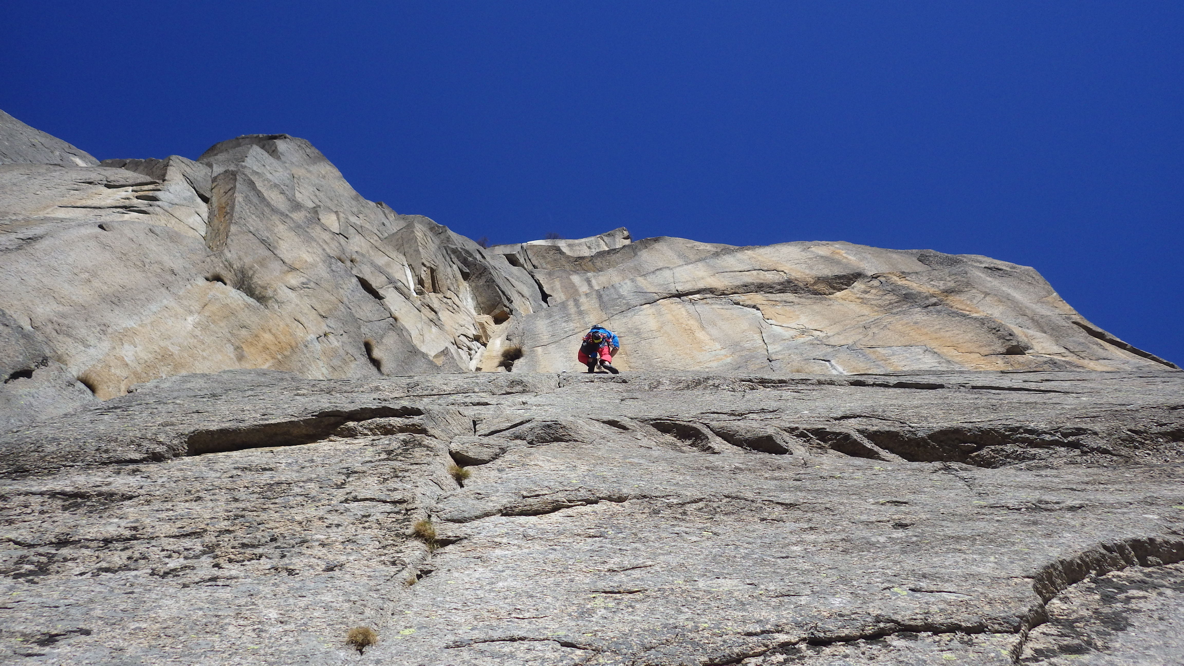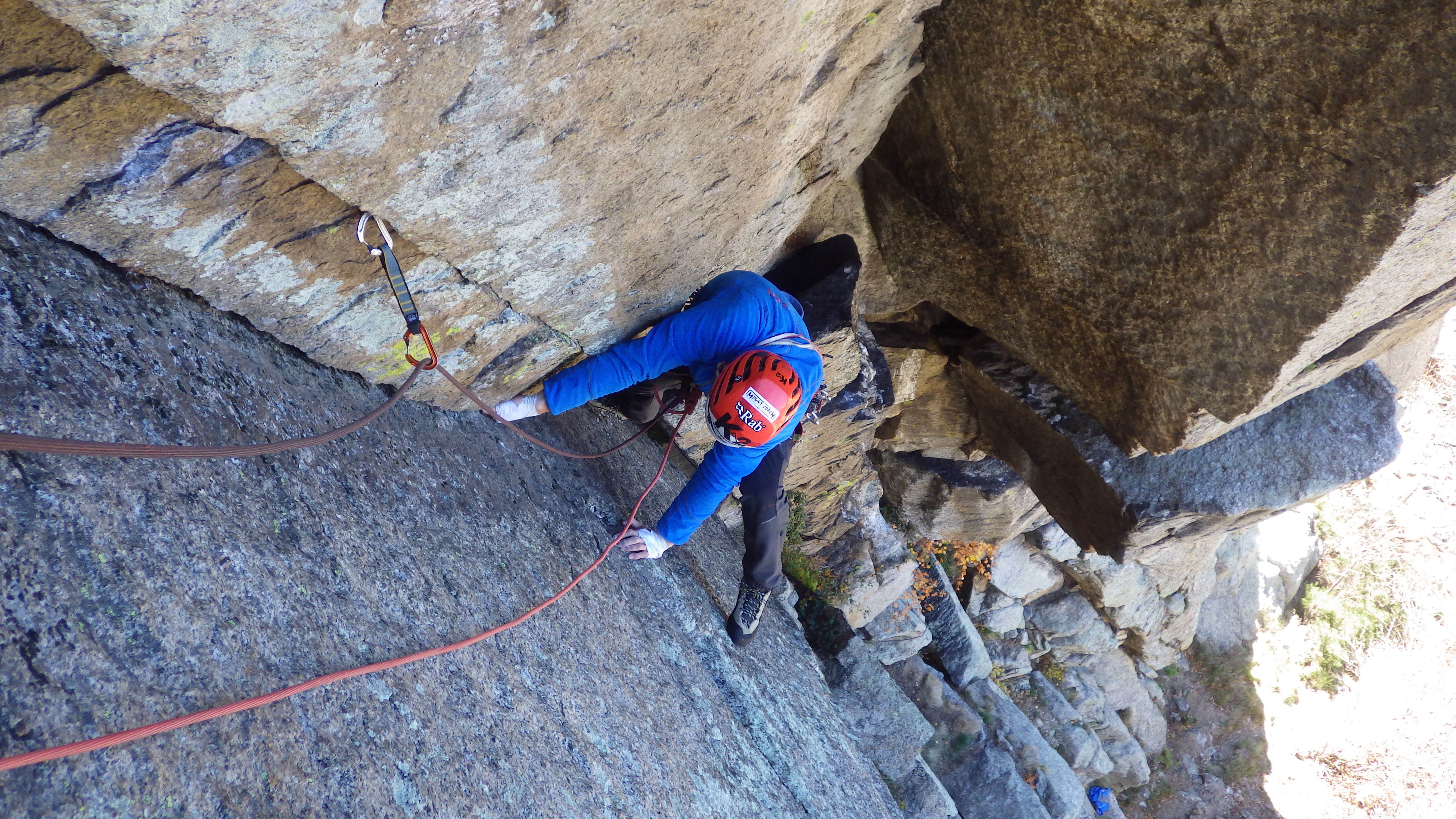 Donderdag loopt onze aanloop naar de sector Caporal. Vandaag zijn er drie cordees waarvan er twee via Orecchio del Pachiderma attaqueren: links van dit olifantenoor gooien Steve en Roel zich in de barsten, rechts van het oor starten Matty en ik. Ondertussen wagen Maarten en Arne zich aan de Diedro Nanchez, die na drie lengtes toch net iets te nat blijkt om door te klimmen, waardoor ook zij ons goede voorbeeld in het oor volgen. Na de barsten langs l’Orrecchio volgt een 6c+ dalle waar duchtig A0 wordt toegepast. De laatste van zes touwlengtes is nog een korte 6c. Op zich best leuk en goed haalbaar, maar na vijf dagen klimmen blijkt een val hier toch voor niemand te ontwijken. Enkele rappels later wandelen we voldaan richting Sergent langsheen de prachtige rivier, en bewonderen we de uitgesleten sporen in de gigantische rotsblokken. Canyonneer Maarten en avontuurlijk gestoorde Roel kunnen het niet laten en doen een plonske in het “frisse” water. Goed zot! “Wij zullen wel gaan zien of Steve en Arne al op de parking zijn met de auto”, gebruiken Matty en ik verstandig als excuus.