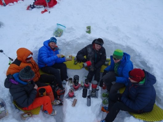 ‘s Woensdags trekken we vol goede moed de deur open en springen enthousiast de buitenlucht in… Om haast van onze sokken te worden geblazen door de ijzige wind. Als door een glas melk zwemmend dalen we af over de Grosser Aletschfirn en navigeren we op kompas en hoogtemeter tot op de geplande bivakplaats op de Gletscherhornfirn. De sneeuwschoppen komen boven en gedreven graven we een put die ons en onze tenten tegen het stormweer moet beschermen. Rugzakken, ski’s en helmen die – gelukkig goed bij elkaar – opzij lagen, zijn al snel bedekt onder een stevige laag pow. Zodra de tenten staan en het materiaal in veilig bereik is vastgeketend, kruipen we als sardientjes in onze tenten om er te eten en reeds vroeg de slaapzak op te zoeken. Goed uitrusten voor de dag erna, volgens voorspellingen de mooiste dag van de week.