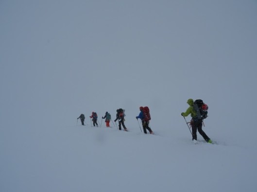 Wanneer wat later ons kamp sneeuwvrij gemaakt is, nemen we onze klimplanning onder de loep. Aangezien het echter nog steeds lijkt alsof we ons aan de binnenkant van een bus slagroom bevinden, gaat ook een ambitieuze vierduizender geen goed idee zijn. Met een pruillipje breken we het kamp op en beginnen we aan een nieuwe navigatietocht door de witte wereld.