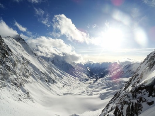 Het einde van februari nadert en zo ook onze geplande stage rond het Mont Blancmassief. Materiaal wordt bijeengesprokkeld, de afspraken voor centrale carpoolplekken worden gemaakt. Nog eens even bij onze lokale klimhippie Andreas checken, die het winterseizoen in Chamonix doorbrengt? “No go, jongens!”, antwoordt hij, “ik ben vorige week in zomerse condities tot aan Vallée Blanche gewandeld. Absoluut niet veilig om daar nu te skiën!” Aanpassing van de plannen dus! Na het afwachten van de uiteindelijke weersverwachtingen, komt de Zwitserse Konkordiaplatz uit de bus. Een stevige sneeuwbui tijdens de eerste twee dagen zal ervoor zorgen dat alle valleien een toerskiparadijs worden, de subzero temperaturen die niet meer met één cijfer uitgedrukt kunnen worden, krijgen alle rots- en ijswandjes in perfecte conditie. Ons enthousiasme kan niet meer op en we vertrekken zo vroeg mogelijk om al een dagje verse poedersneeuw te kunnen happen op de piste. Jozua kan last minute nog sneeuwkettingen regelen, want boy oh boy gaan we die nodig hebben!