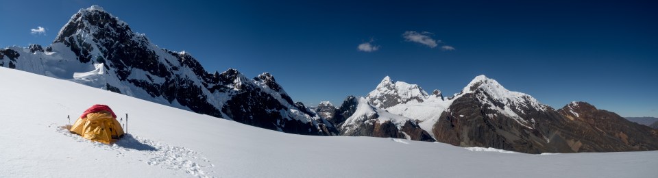 Our glacier camp. From left to right: Cayesh (5721, with satellites) – Huantsan (6395m) – San Juan (5843m)