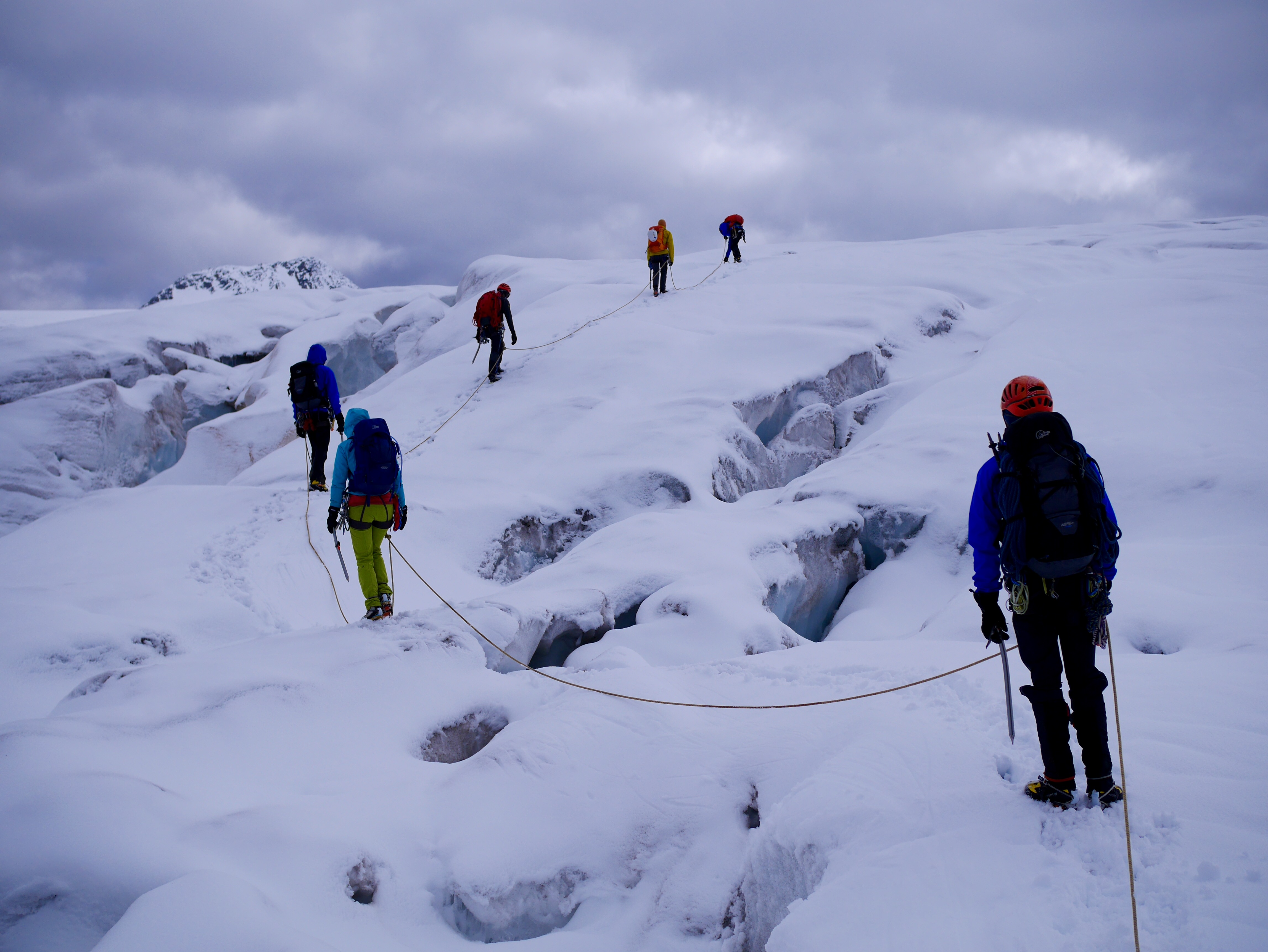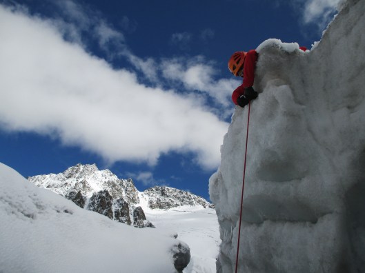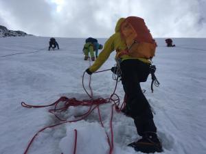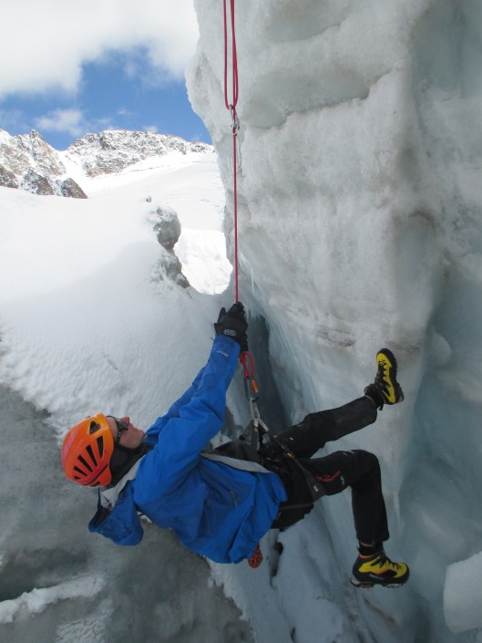 Na onze ontspannen stop in de Rauhekopfhütte zetten we onze tocht verder richting het Brandenburger Haus, hiervoor moesten we over de Gepatschferner. De op één na grootste gletsjer van Oostenrijk, die een vrij horizontaal oppervlakte bestrijkt. Maar waarbij in de iets steilere stukken, gigantische spalten netwerken worden gevormd. Het ideale terrein dus, voor het oefenen van spaltenreddingen. Het werd een leerrijke stop waarin we ons amuzeerden met enkele nieuwe touwtechnieken.