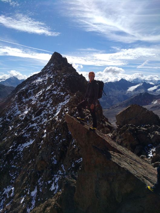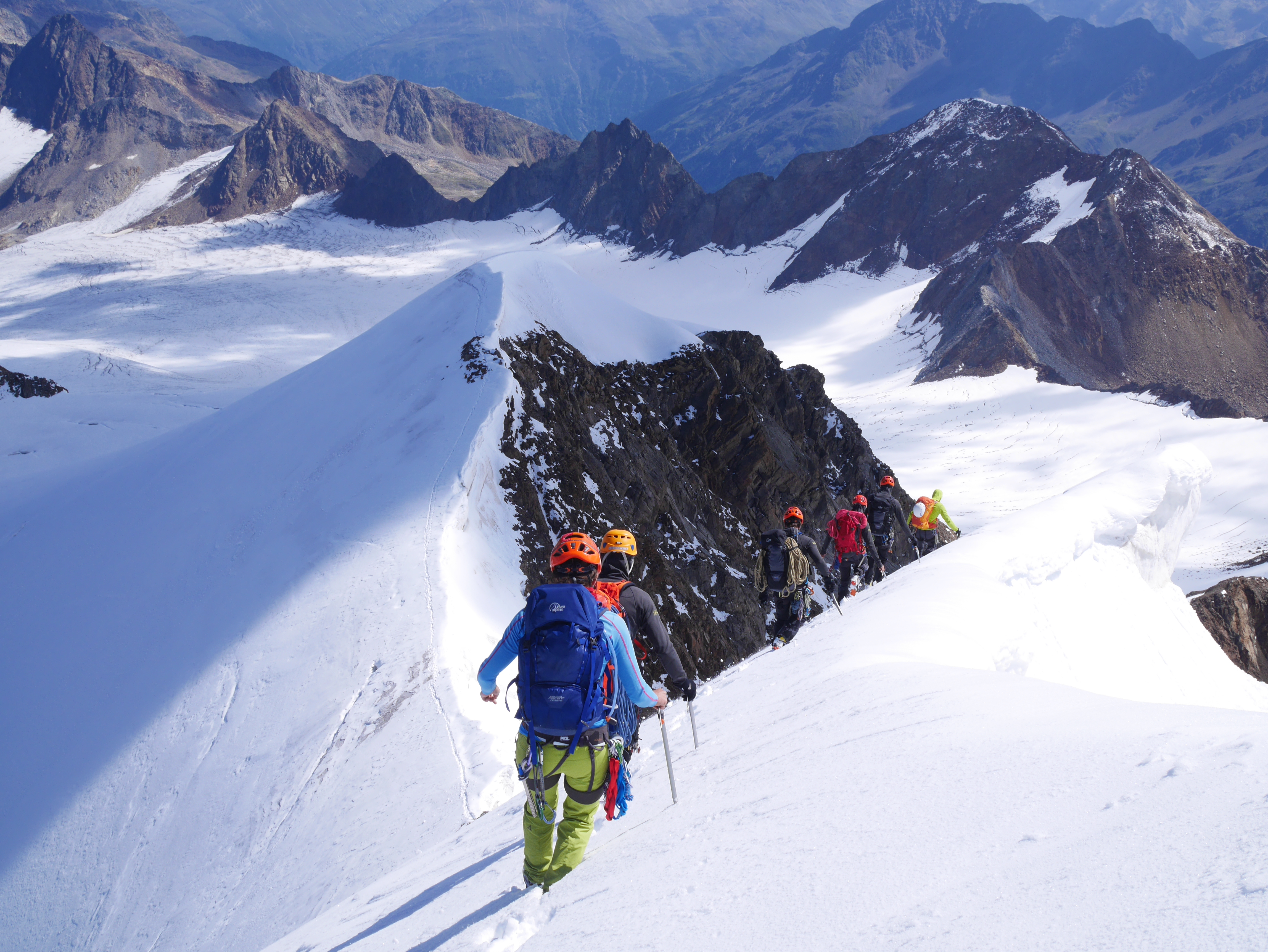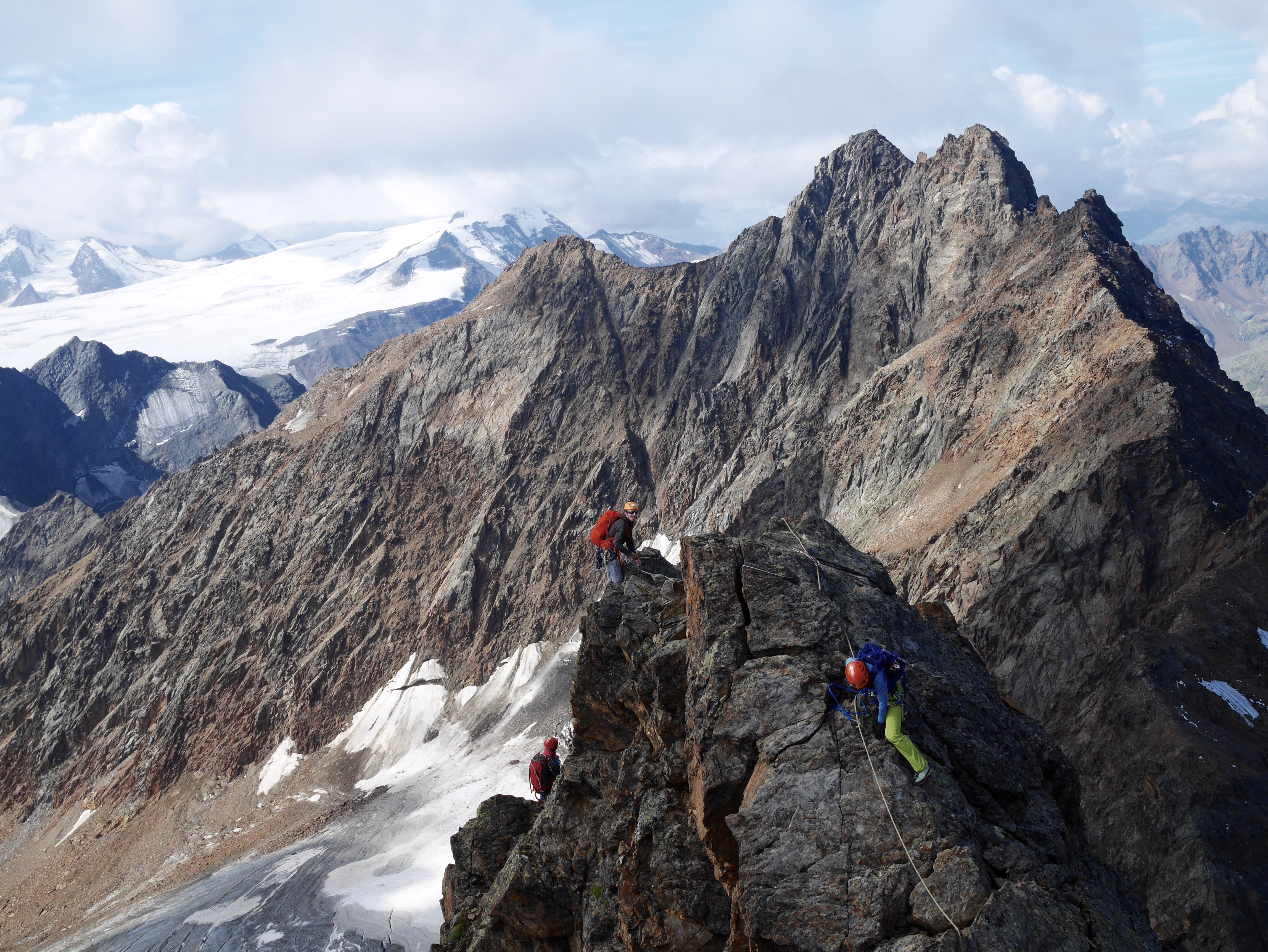 Op onze tocht van het Brandenburger Haus naar de Vernacht Hütte bereikten we via de zuidwest graat de top van de Fluchtkogel (3500m). Hierna staken we door naar de noordoost graat en van daaruit traverseerden we verder over de graat langs het Hintergrasl Joch en de Hintergrasl Spitze (3325m), waarna we afdaalden richting de Vernacht Hütte. Het was onze eerste graatbeklimming zonder sneeuw, wat dit een zeer leerrijke ervaring maakte. We vorderden snel, ondanks het relatief slechte terrein met veel losse stenen, waardoor we vrij voeg in de hut aankwamen en extra lang konden genieten van onze overheerlijke Kaiserschmarren.