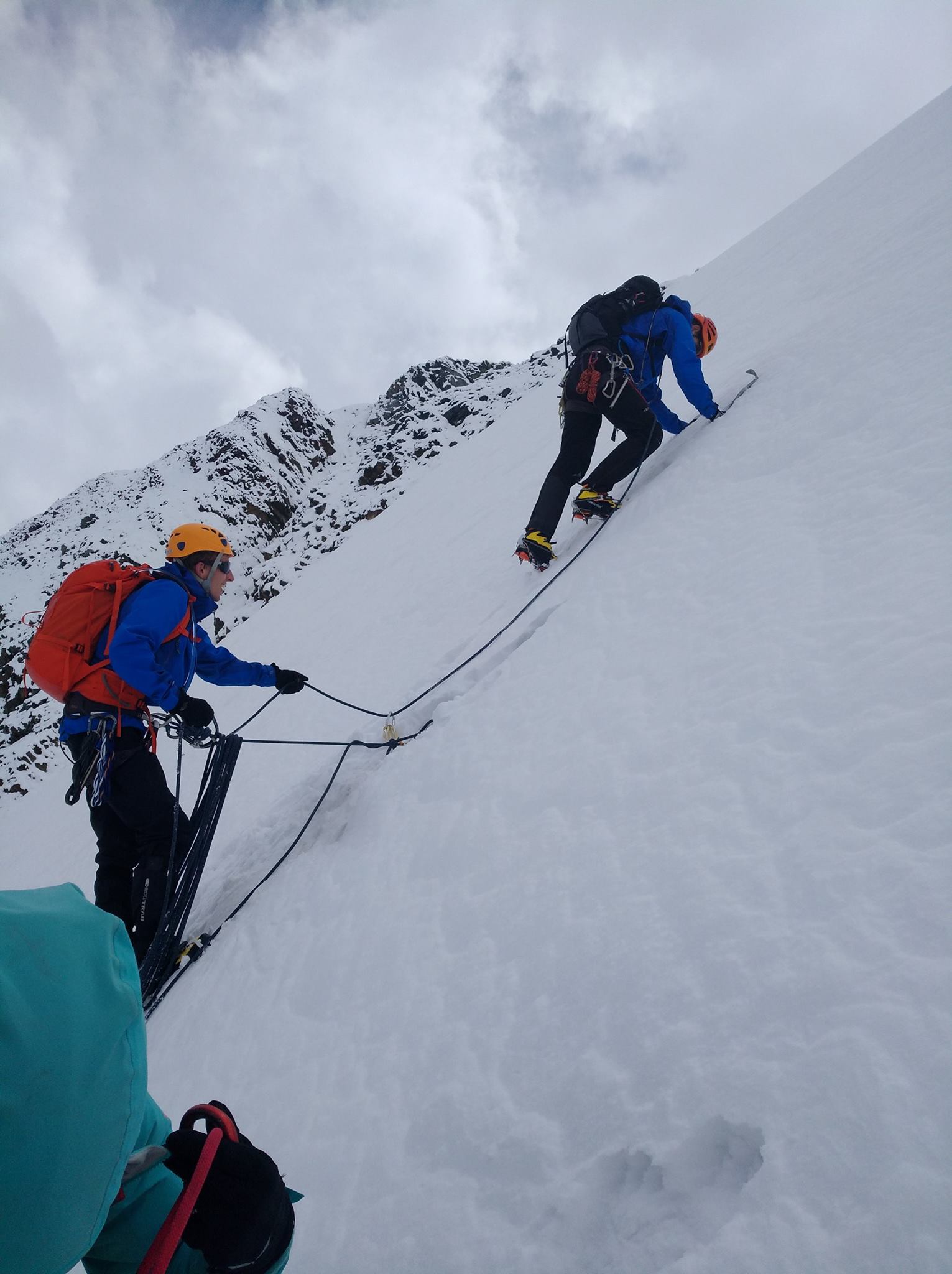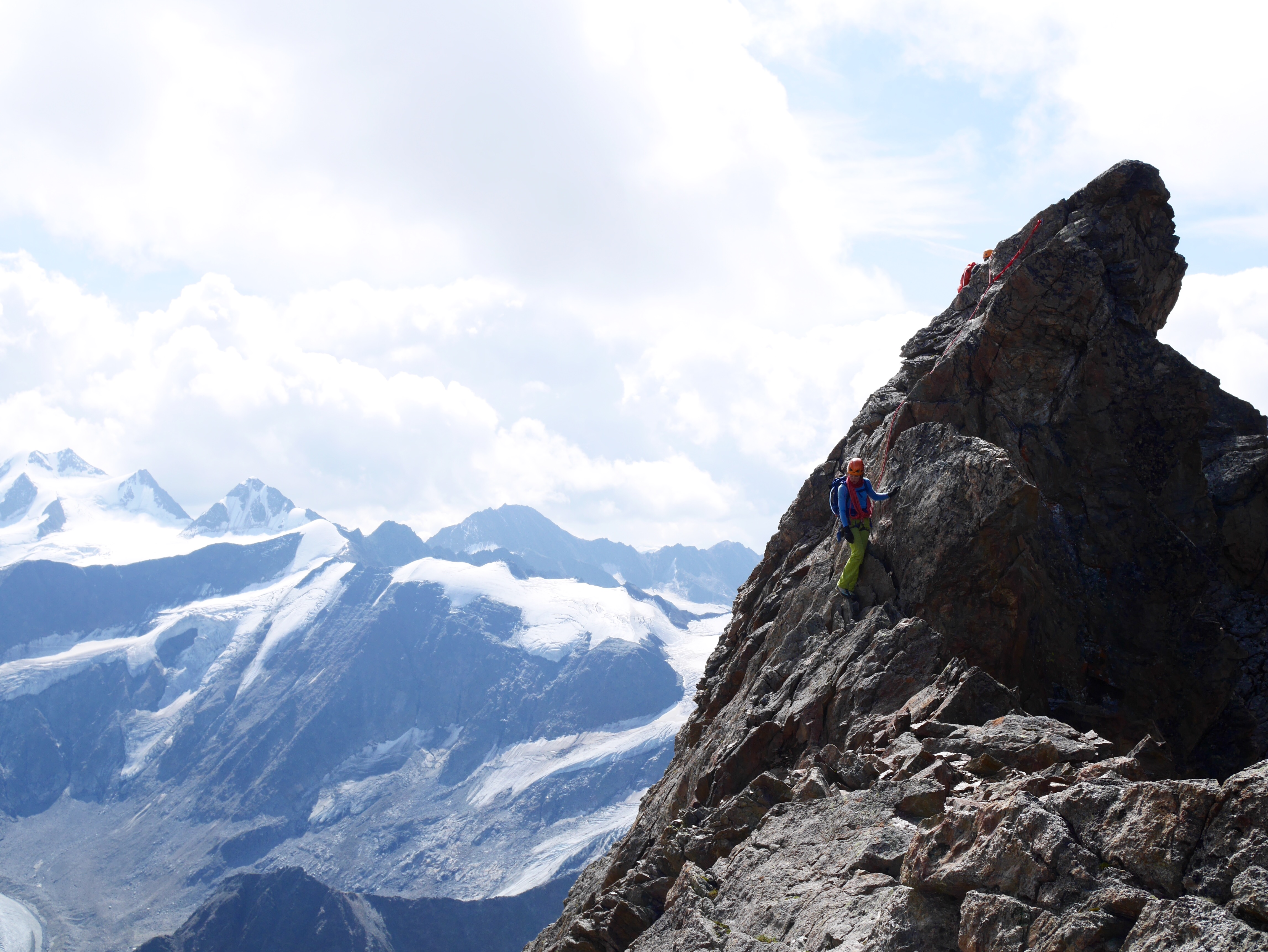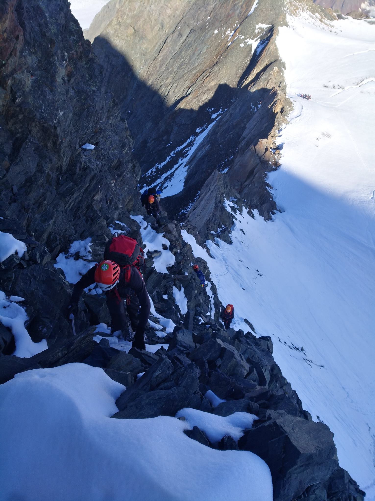 Op onze tocht van het Brandenburger Haus naar de Vernacht Hütte bereikten we via de zuidwest graat de top van de Fluchtkogel (3500m). Hierna staken we door naar de noordoost graat en van daaruit traverseerden we verder over de graat langs het Hintergrasl Joch en de Hintergrasl Spitze (3325m), waarna we afdaalden richting de Vernacht Hütte. Het was onze eerste graatbeklimming zonder sneeuw, wat dit een zeer leerrijke ervaring maakte. We vorderden snel, ondanks het relatief slechte terrein met veel losse stenen, waardoor we vrij voeg in de hut aankwamen en extra lang konden genieten van onze overheerlijke Kaiserschmarren.